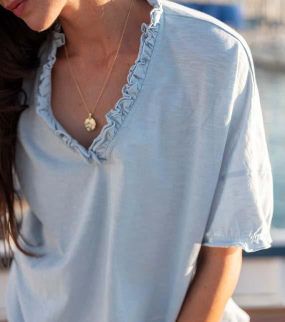 NEW COLORS! This versatile V-neck tee has feminine flair, with ruffles lining the neck and sleeves that take your everyday top up a notch. Easy to love, even easier to dress up—this tee goes from fresh and cozy as a set to elevated and chic with shorts, pants or jeans. Amelia is a best-seller and your best friend.