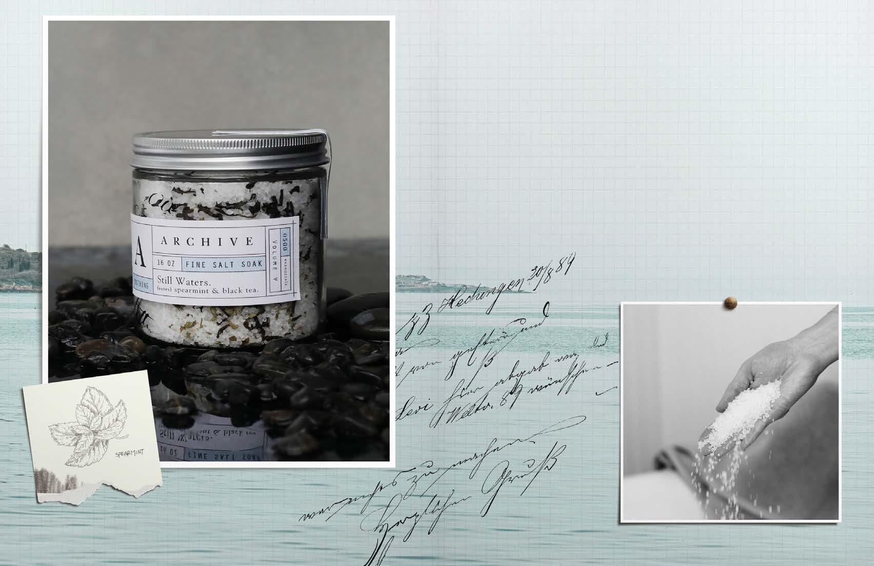 simple & serene Still Waters. For whatever the day brings. Rich in purifying minerals to relax the body, moisturize skin and eliminate toxins, this bespoke salt soak is blended with mind-cleansing Spearmint & Black Tea for a head-to-toe calm. Notes : SPEARMINT & BLACK TEA Qualities : SOOTHING Volume : 0500 fine salt soak 35Z05 CASE PACK OF 4 $14.00 / EA 152 / MARGOT ELENA / ARCHIVE WHOLESALE.MARGOTELENA.COM 1-888-896-6398 153