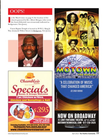 n the March issue on page 8, the location of the church pastored by Rev. Albert Morgan (who wrote the Guest Editorial) was erroneously indicated as Bridgewater, New Jersey. Union Baptist Temple is located at 30 M. L. King Jr. Way (formerly Willow Street) in Bridgeton, New Jersey.