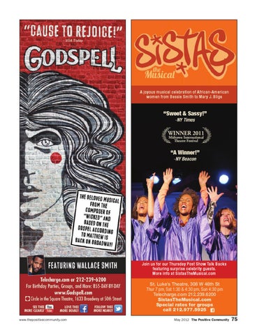 Join us for our Thursday Post Show Talk Backs featuring surprise celebrity guests. More info at SistasTheMusical.com St. Luke’s Theatre, 308 W 46th St Thur 7 pm, Sat 1:30 & 4:30 pm, Sun 4:30 pm Telecharge.com 212.239.6200 SistasTheMusical.com Special rates for groups call 212.977.5925 www.thepositivecommunity.com
