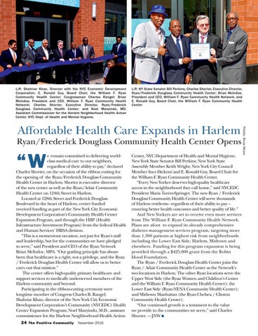 e remain committed to delivering worldclass medical care to our neighbors, regardless of their ability to pay,” declared Charles Shorter, on the occasion of the ribbon cutting for the opening of the Ryan/Frederick Douglass Community Health Center in Harlem. Shorter is executive director of the new center as well as the Ryan/Adair Community Health Center on 124th Street in Harlem. Located at 128th Street and Frederick Douglass Boulevard in the heart of Harlem, center funded received funding as part of the New York City Economic Development Corporation’s Community Health Center Expansion Program, and through the HIIP (Health Infrastructure Investment Program) from the federal Health and Human Services’ HRSA division. “This is a momentous occasion, not just for Ryan’s staff and leadership, but for the communities we have pledged to serve,” said President and CEO of the Ryan Network Brian McIndoe, MPA. “Our guiding principle has always been that healthcare is a right, not a privilege, and the Ryan / Frederick Douglass Health Center will allow us to better carry out that mission.” The center offers high-quality primary healthcare and support services to medically underserved members of the Harlem community and beyond. Participating in the ribbon-cutting ceremony were longtime member of Congress Charles B. Rangel; Shahriar Khan, director of the New York City Economic Development Corporation’s Community (NYCEDC) Health Center Expansion Program; Noel Manyindo, M.D., assistant commissioner for the Harlem Neighborhood Health Action 24 The Positive Community November 2016