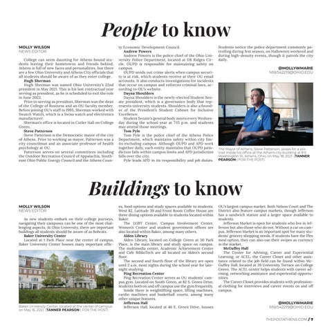 People to know MOLLY WILSON NEWS EDITOR College can seem daunting for Athens-bound students leaving their hometowns and friends behind. Athens is full of new faces and personalities, but there are a few Ohio University and Athens City officials that all students should be aware of as they enter college. Hugh Sherman Hugh Sherman was named Ohio University’s 22nd president in May 2021. This is his last contractual year serving as president, as he is scheduled to exit the role in June 2023. Prior to serving as president, Sherman was the dean of the College of Business and an OU faculty member. Before joining OU’s staff in 1995, Sherman worked with Swatch Watch, which is a Swiss watch and electronics manufacturer. Sherman’s office is located in Cutler Hall on College Green. Steve Patterson Steve Patterson is the Democratic mayor of the city of Athens. Prior to working as mayor, Patterson was a city councilman and an associate professor of health psychology at OU. Patterson serves on several committees including the Outdoor Recreation Council of Appalachia, Southeast Ohio Public Energy Council and the Athens Coun-