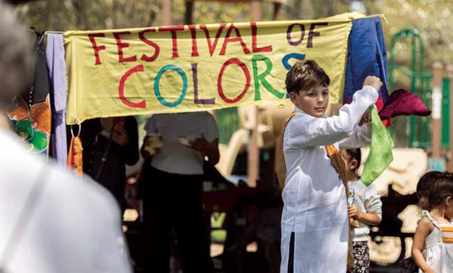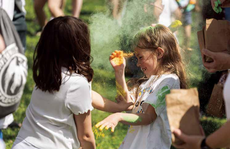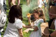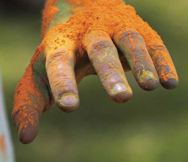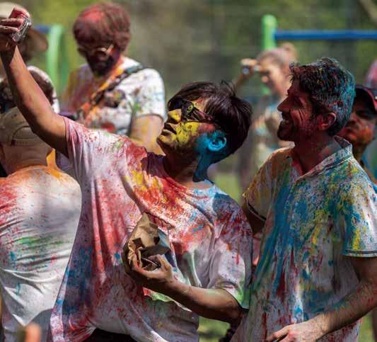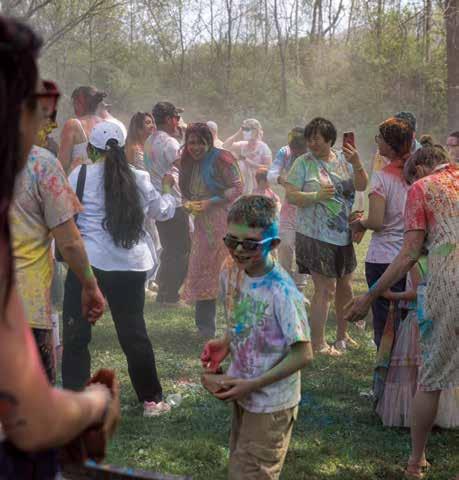Left. Attendees throw colored powders and water on each other during the “Festival of Color” Holi celebration at the West State Street Park in Athens, April 12, 2026.