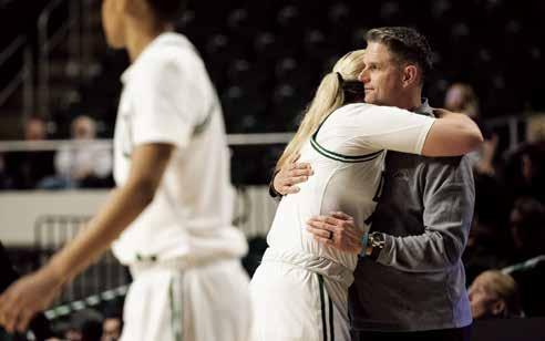 Ohio University senior Abby Garnett (20) hugs head coach Bob Bolden after she exits her last game against Eastern Michigan at the Convocation Center on March 4, 2023. (JACK TATHAM | FOR THE POST)