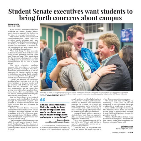 Student Senate executives want students to bring forth concerns about campus EMILY LEBER FOR THE POST When students at Ohio University see problems on campus, Student Senate wants them to approach the body with the issues to come up with solutions. The Student Senate executive board consists of President Landen Lama, Vice President Nicole Schneider and Treasurer Zach Woods. Schneider compared the body to a student council in high school when she talked to students at the involvement fair, which takes place in the fall before classes begin. “The first thing I’ve told students at the involvement fair is that we are like a student governing body on campus,” Schneider said. “So a lot of times for the first years, I compare it to what their high school government was, like student council, but it’s kind of upped a level.” The three executive members stressed the importance of students getting involved on campus. With that, Woods said when freshmen go to the involvement fair there are usually so many organizations recruiting that it actually can discourage them from getting involved, rather than encourage them. “There’s just so many options you’re just kind of overwhelmed by it but (it’s important) just to find your passion and get involved with it,” Woods said. “Yes, we’re here for academics. Yes, we’re here for our majors and our careers, but getting involved is where you find those connections, where you learn those real life lessons, where you become the person that you are supposed to be.” One way for freshmen to get involved on campus and with Student Senate is through its internship program. The program is designed to help teach and train students who are interested in joining senate. Former Student Senate President Hannah Clouser started out with senate through its internship program and will be working in New York City as an actuarial associate in the fall. Lama said the internship program shaped Clouser into the person she is today. “We have an excellent intern program which is really geared towards freshmen,” Woods said. “We have them on a rotating schedule so they can see which commission they would be most likely to fit (into).”