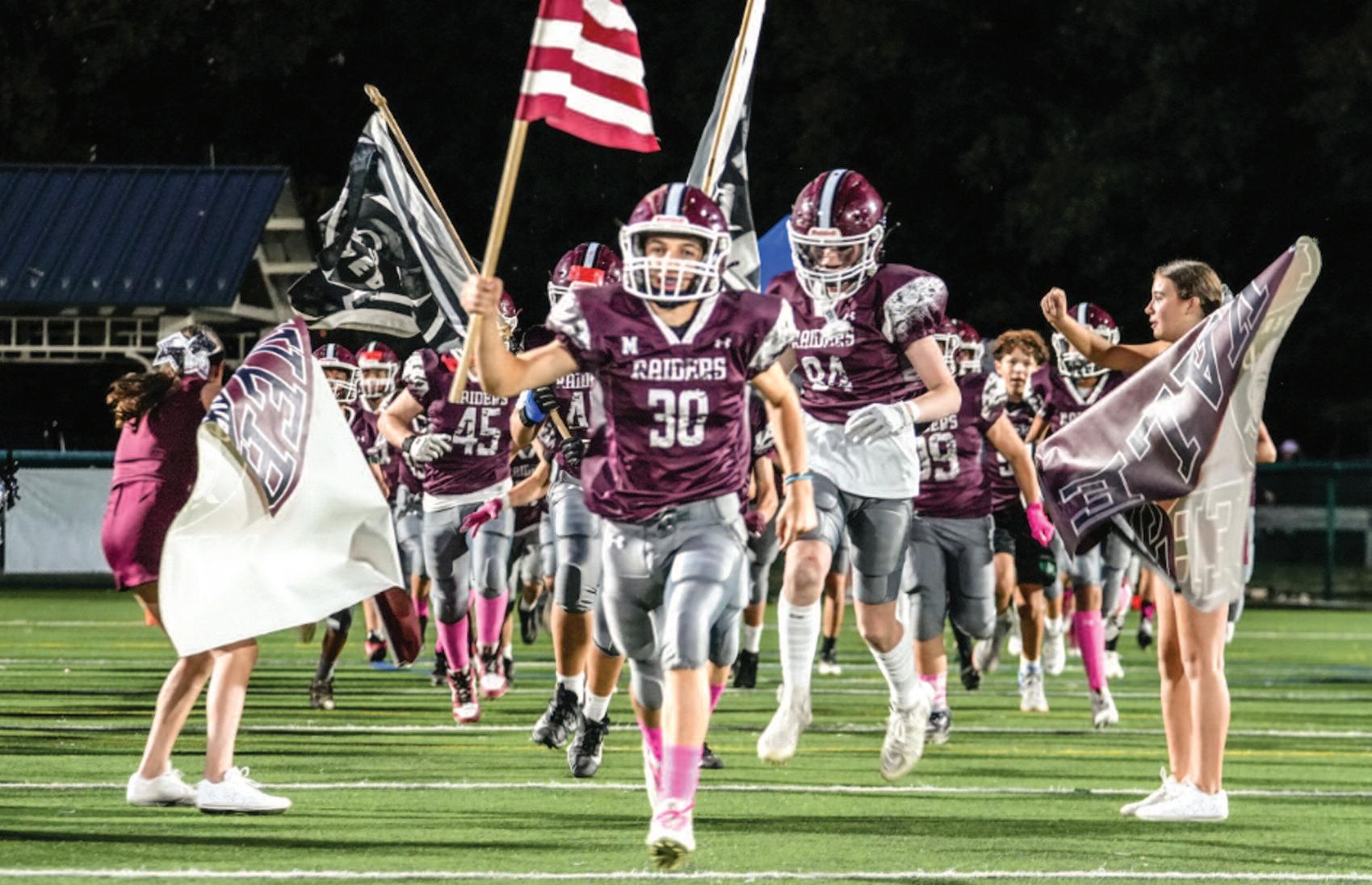 A nice, friendly game: River Vale Raiders senior football players rip through their banner to kick off the 2024 Friendship Bowl against the Hillsdale Hawks on Saturday. The final: 14-0, Raiders. CourtesyMike Smith/cdmphotovideo.