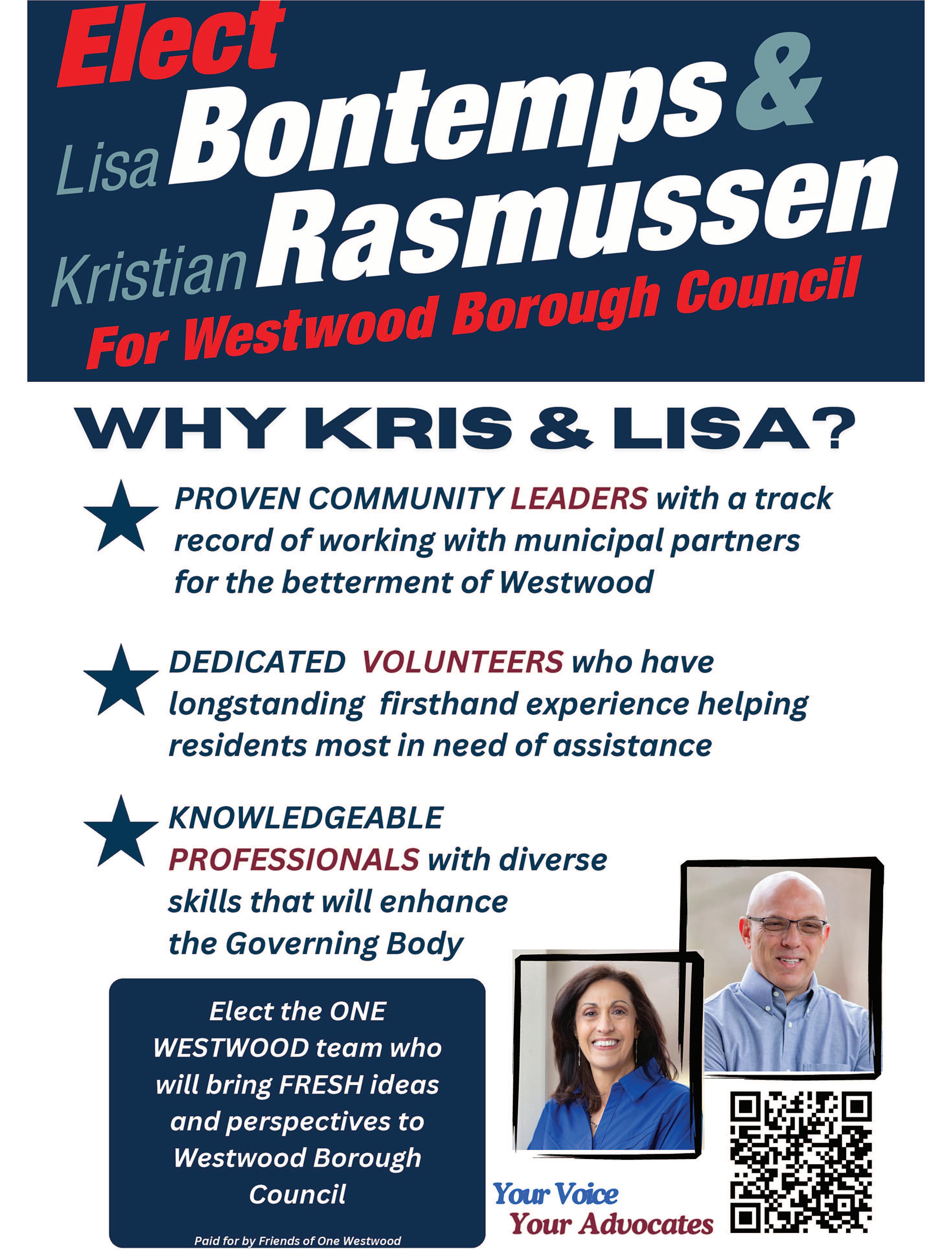 IʼMPLEASEDTO write in support of Lisa Bontemps and Kris Rasmussen as candidates for Westwood Borough Council. They have the experience, drive, and perspectives needed to solve