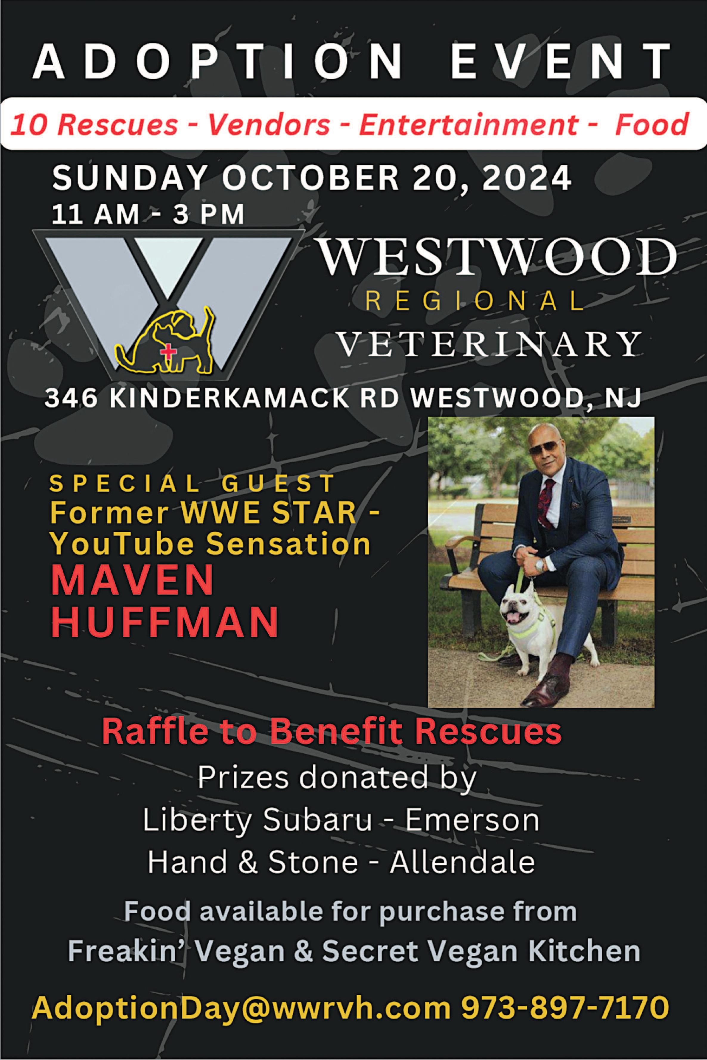 Westwood Regional Veterinary Hospital is hosting its first Pet Adoption and Fundraiser Event, featuring special guest Maven Huffman, former WWE star, and YouTube sensation.