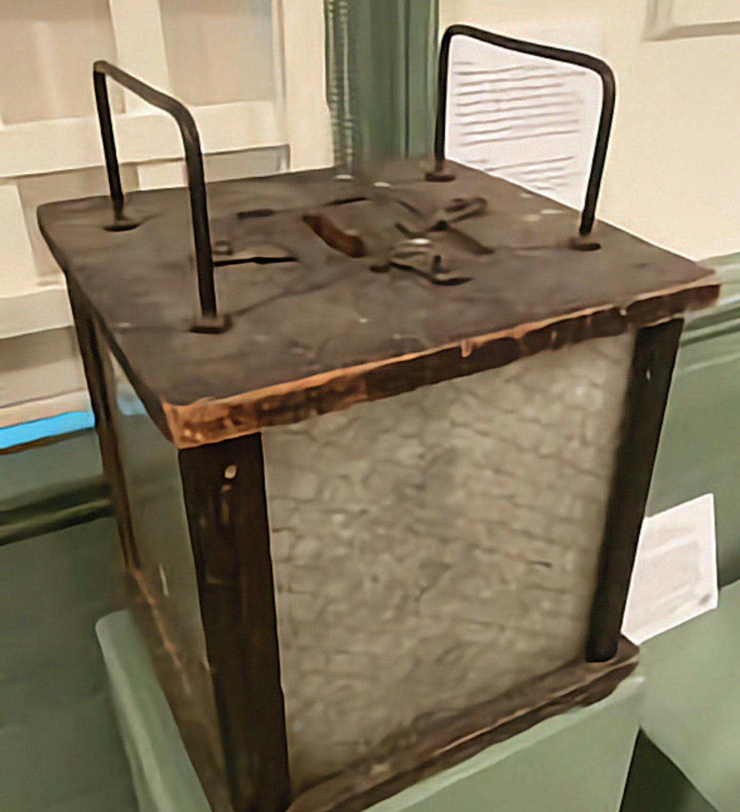 19th century ballot box from the Pascack Historical Society’s collection. The box was protected by three locks, each with a unique key. The Election Board members holding the keys represented the two leading parties— two from one party and one from the other. Only in the presence of all three men could the box be opened. This was an early effort at preventing election fraud.