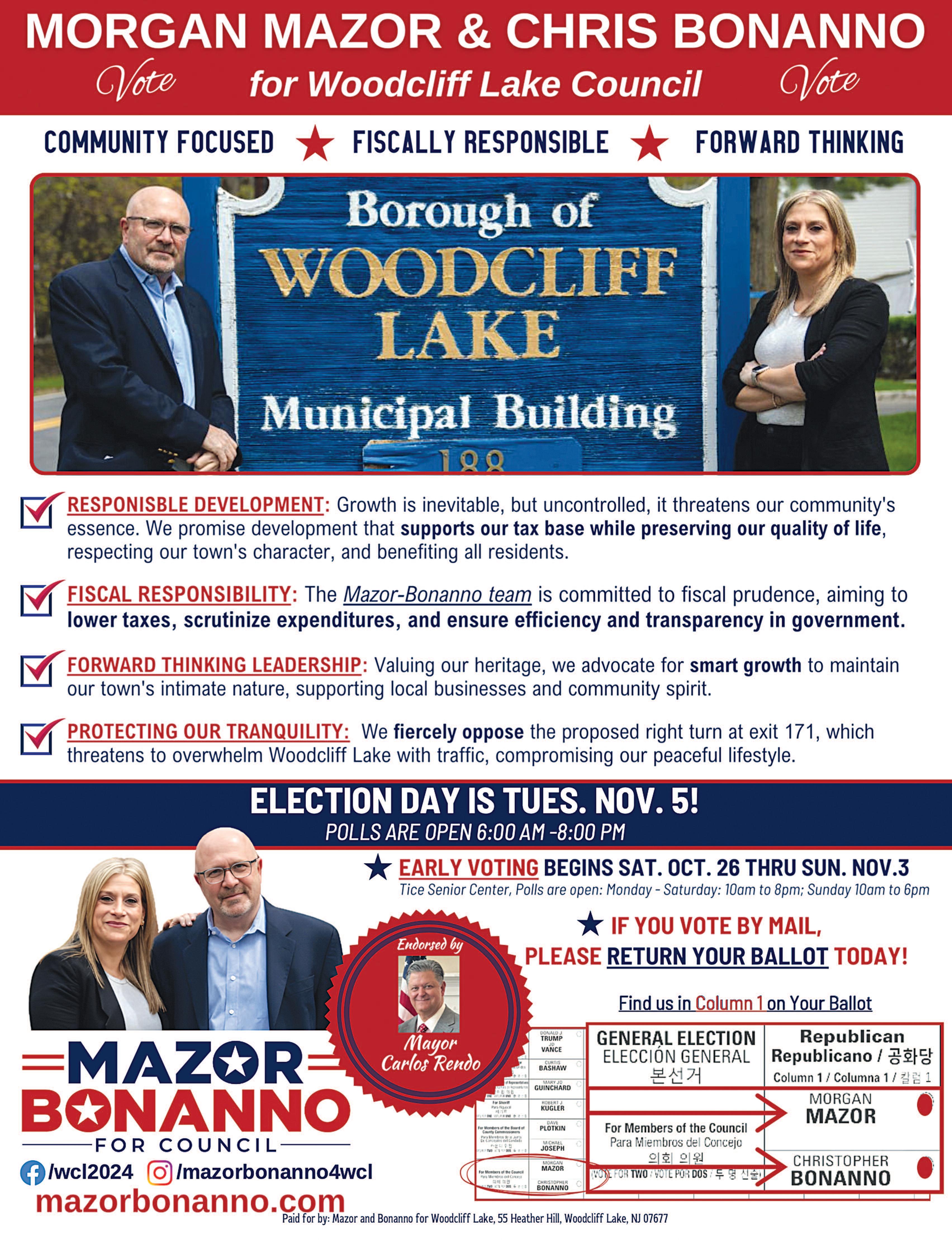 wood voters have led the Pascack Valley in voting for Democratic candidates in the 2008, 2012, 2016, and 2020 Presidential elections, yet did not continue with down ballot candidates. While there could be many reasons for that, this year can be different. I strongly urge votes be cast for Kamala Harris for President and continue down ballot for Andy Kim for U.S. Senate, Josh Gottheimer for U.S. Congress, Tracy Zur and Steve Tanelli for County Commissioner, and in Westwood the best and most selfless Borough Council candidates