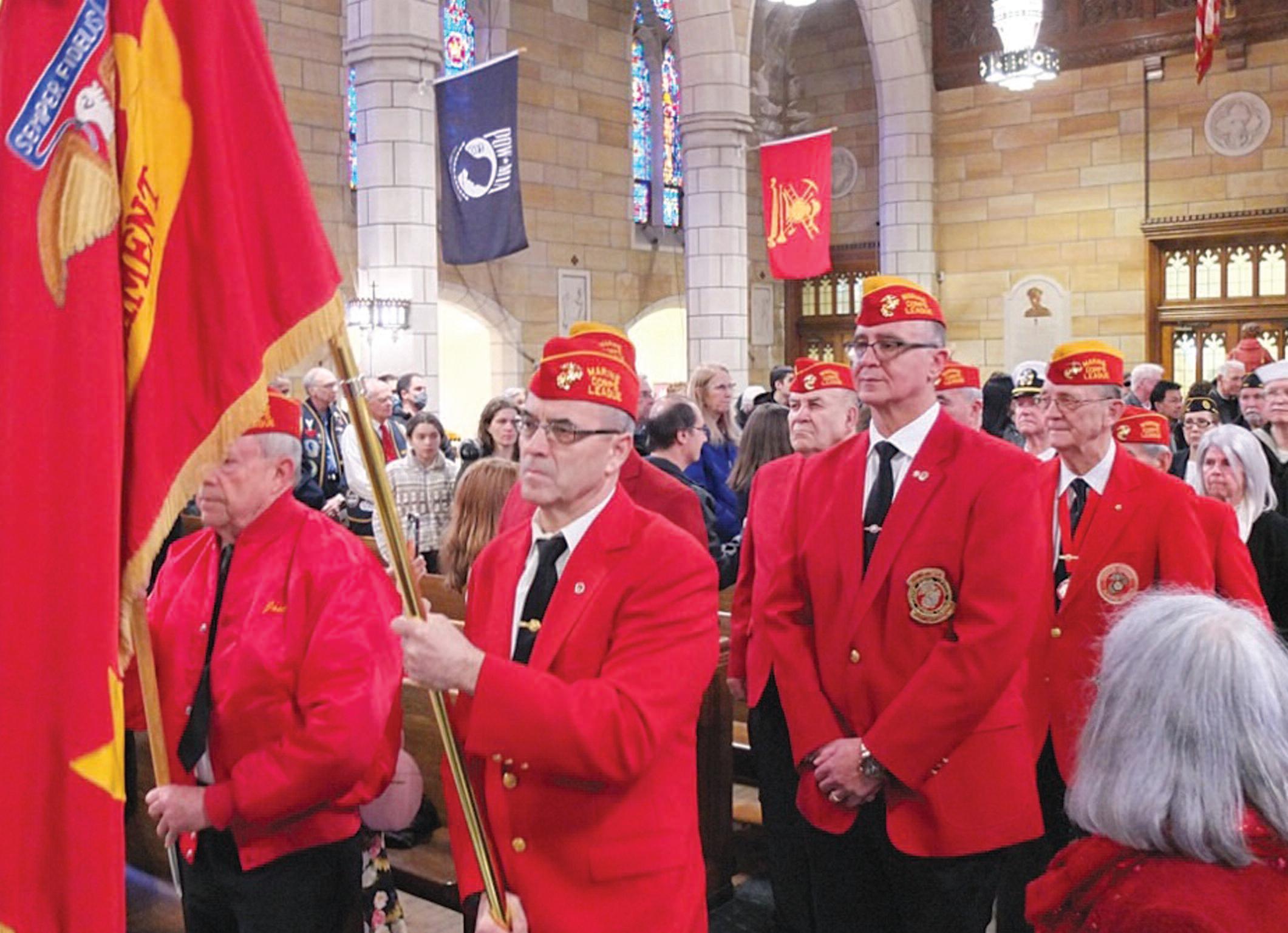 The Mass first paid tribute to the Four Chaplains — as the men are universally known — with a presentation of colors featuring veterans organizations, Boy Scouts, and the Knights of Columbus. Later, the St. Columcille United Gaelic Pipe Band played a rousing rendition of “Amazing Grace,” and parish musicians performed fitting tunes like “God Bless America” and “No Greater Love.”
