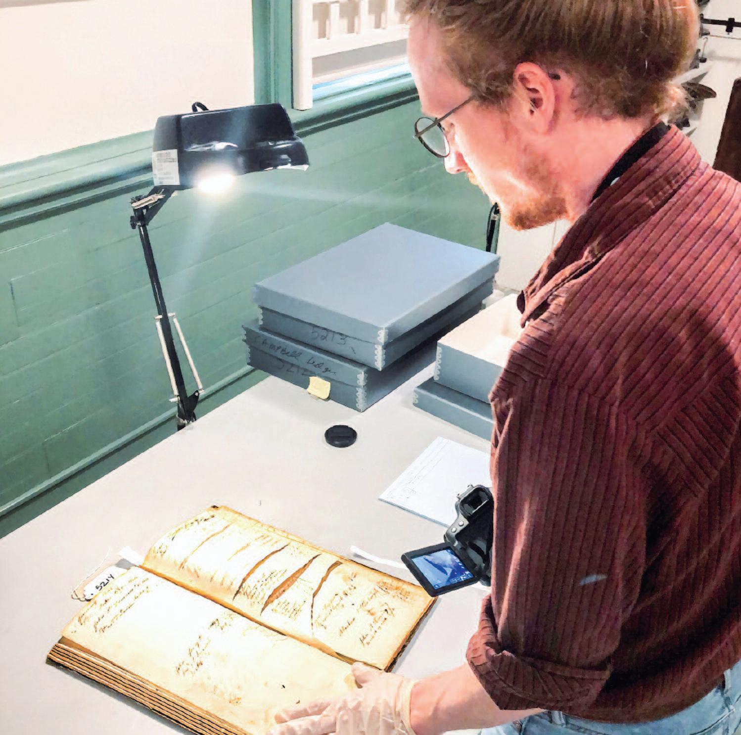 Left: Once located inside the Campbell mill, this wampum hairpipe drilling machine, the only one in existence, is displayed at the Pascack Historical Society’s museum. Right: Dr. Eric Johnson, then a doctoral candidate, in 2019 at the Pascack Historical Society, studying the Campbell family’s 19th century business ledgers. Johnson, now a postdoctoral fellow at Brown University, will visit the Pascack Historical Society on Sunday, Feb. 19 at 2 p.m. to share his findings.