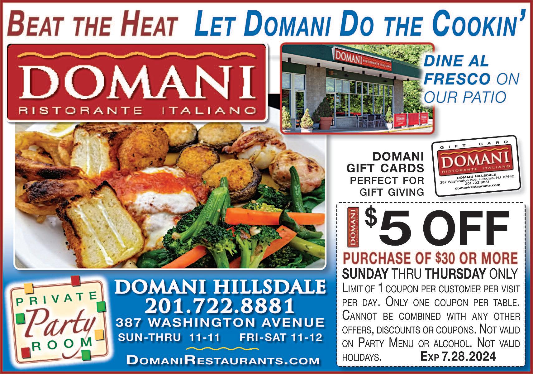 2 J I U N E 2 4 , 2 0 2 4 • P A S C A C K V A L L E Y P R E S S DRIVING SCHOOL INC. Lic. # 045-85N • Highly Respected, Full Service Driving School • Prep Lessons, 6 Hour Lessons & Road Tests • Experienced State Licenced Instructors Call Now to Schedule Your Appointment! 12 Lincoln Blvd., Suite 103, Emerson, NJ 201-666-4147 since 1978 426 HILLSDALE AVE., HILLSDALE, NJ STOP IN AND SEE TIM & RALPH! TIM’S BA RBER SHOP TIM’S BA RBER SHOP TUES-FRI 8AM-4:00PM • SAT 8AM-12PM HOT TOWEL SHAVES MEN’S CUTS $25 SENIOR CUTS $18 (Tuesday Thru Friday ONLY) John’s Famous Bagel & Deli • 201.930.4940 With this coupon. Not valid with other offers. Offer expires 6/30/24 Lamb &Chicken Basmati Rice, Falafel Bread PARK RIDGE 183 KINDERKAMACK RD • 201-930-4940 WOODCLIFF LAKE 94 BROADWAY • 201-746-6257 John’s FAMOUS BAGELS & DELI MONDAY-FRIDAY6AM-4PM John’s Famous Bagel & Deli • 201.930.4940 With this coupon. Not valid with other offers. Offer expires 6/30/24 John’s Famous Bagel & Deli • 201.930.4940 With this coupon. Not valid with other offers. Offer expires 6/30/24 John’s Famous Bagel & Deli • 201.930.4940 With this coupon. Not valid with other offers. Offer expires 6/30/24 6 BAGELS $ 5 99 FREE MUFFIN W/PURCHASE OF 2 MUFFINS CHEF’S SPECIAL JUICY PLATTER 4FREE BAGELS W/PURCHASE OF 12 BAGELS www.johnsfamousbagelsdeli.com +TAX 2 FREE BAGELS W/ PURCHASE OF 6 BAGELS With this coupon. Not valid with other offers. Offer expires 6/30/24 $ 10 99 6 BAGELS, 1/2 LB. CREAM CHEESE & 1/4 LB. SLICED NOVA $ 2199 +TAX ( (AADDDDIITTIIOONNAAL L $ $11000 0 F FOOR R E EVVEERRY Y 5 50 0 G GRRAAMMS S O OF F G GOOLLD D O OR R P PLLAATTIINNUUM M • W WIITTH H C COOUUPPOONN) ) 14 WESTWOOD AVE., WESTWOOD, NJ • 201.722.1550 WE BUY GOLD &DIAMONDS Get Additional $100 for your Gold & Unwanted Jewelry TOP CASH PAID BellagioJEWELERS AVAILABLE AT Sell Your Jewelry, Gold, Platinum, Silver With Or Without Stones In Any Condition GOLD IS AT ALL-TIME HIGHS! www.bellagiojewelers.com PASCACKVALLEY