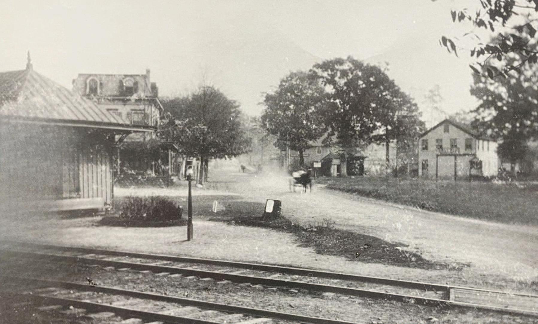 An eastward view in early Montvale captures a horse-drawn wagon approaching the railroad crossing on Grand Avenue. To the left, the Montvale station and Ackerman general store. To the right, Linderman's livery stable.