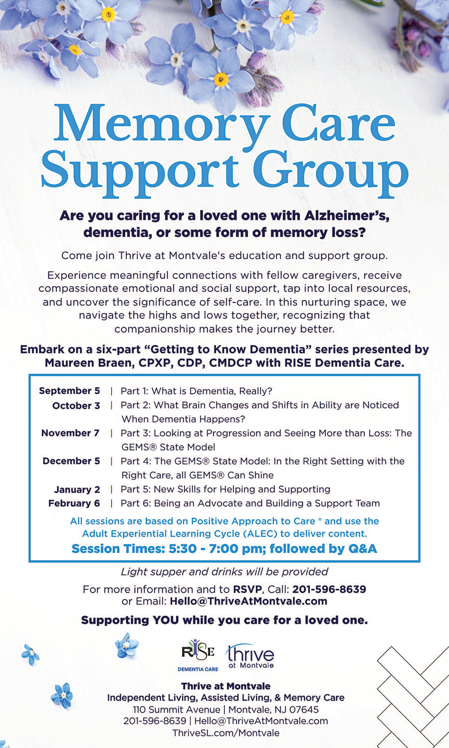 Parkinsonʼs, Alzheimerʼs, or another form of dementia? Join a kind, supportive group that meets to offer advice, ideas, guidance, and open communication. Meetings are held on the second Saturday of every month at the Westwood Library, 49 Park Ave., at 10:30 a.m. All are welcome; no registration is required. Sessions are facilitated by a representative from the Alzheimerʼs Association of Bergen County.