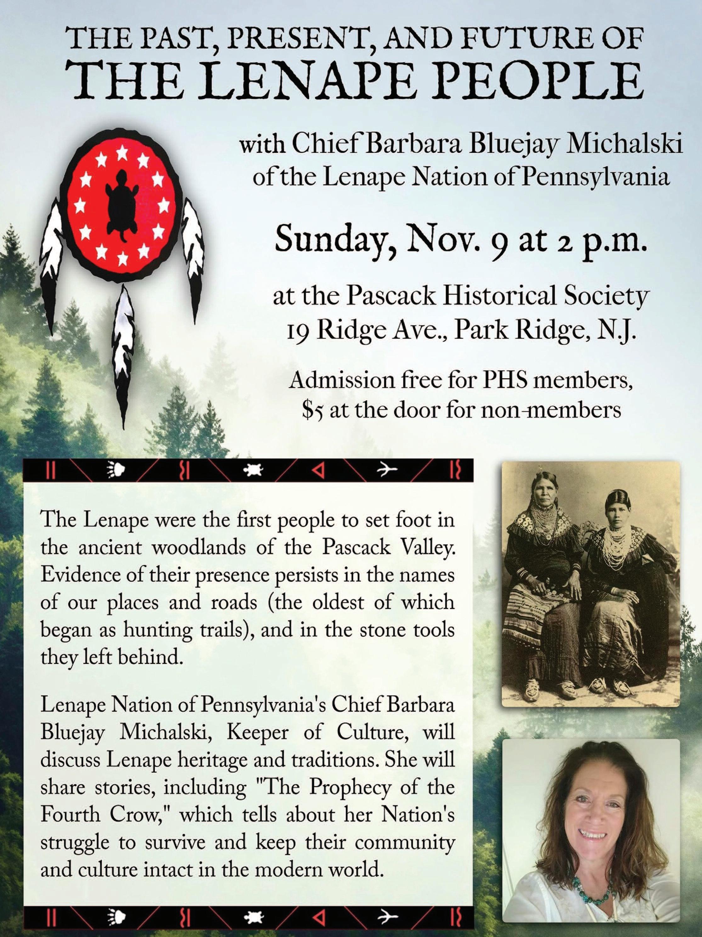 The Pascack Historical Society is delighted to host a special presentation by Chief Barbara Bluejay Michalski of the Lenape Nation of Pennsylvania on Sunday, Nov. 9 at 2 p.m. in the museumʼs lecture hall, 19 Ridge Ave.