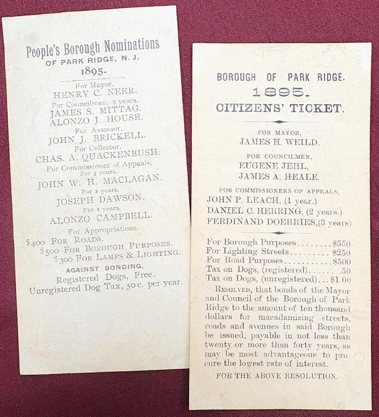 From the collection of the Pascack Historical Society, these tickets date to the 1895 Park Ridge election.