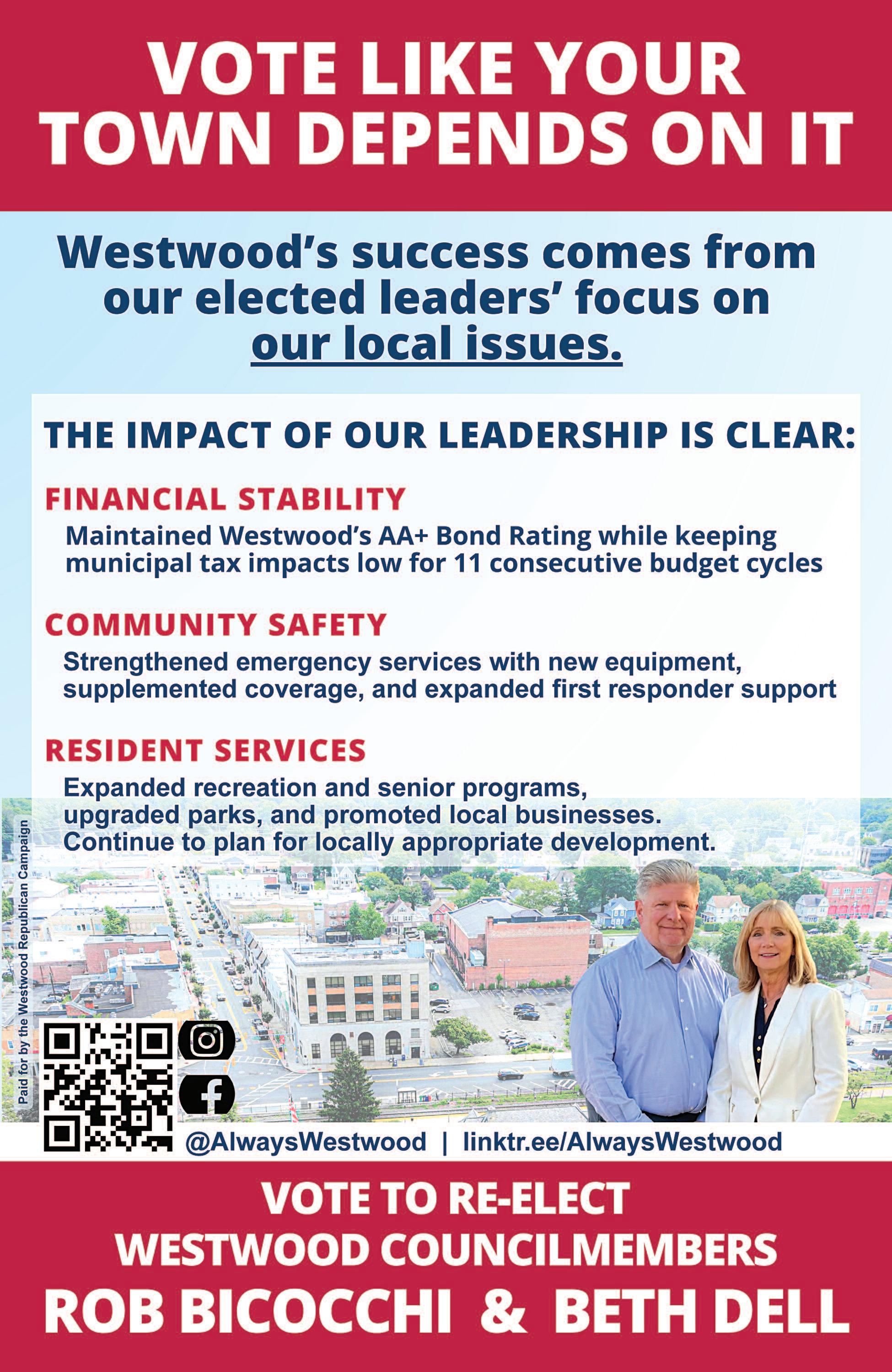 and 13 years on the Land Use Board—I have seen how their tireless involvement has had an overwhelming and lasting impact on our borough. Beth and Rob continue to be the best choice for Westwood. My continued thanks to them, and to all of our amazing Westwood volunteers.