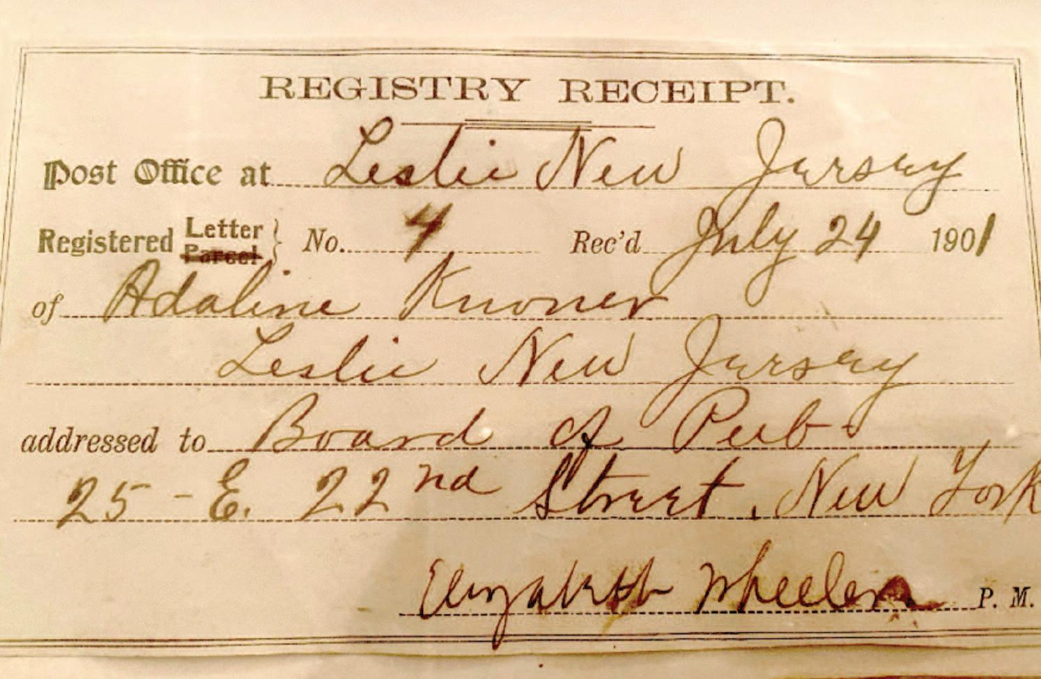 New Jersey, post office. The receipt is signed by postmaster Elizabeth Wheeler, who held the position from 1900 to 1902. Elizabeth and her husband boarded at the Leslie residence.