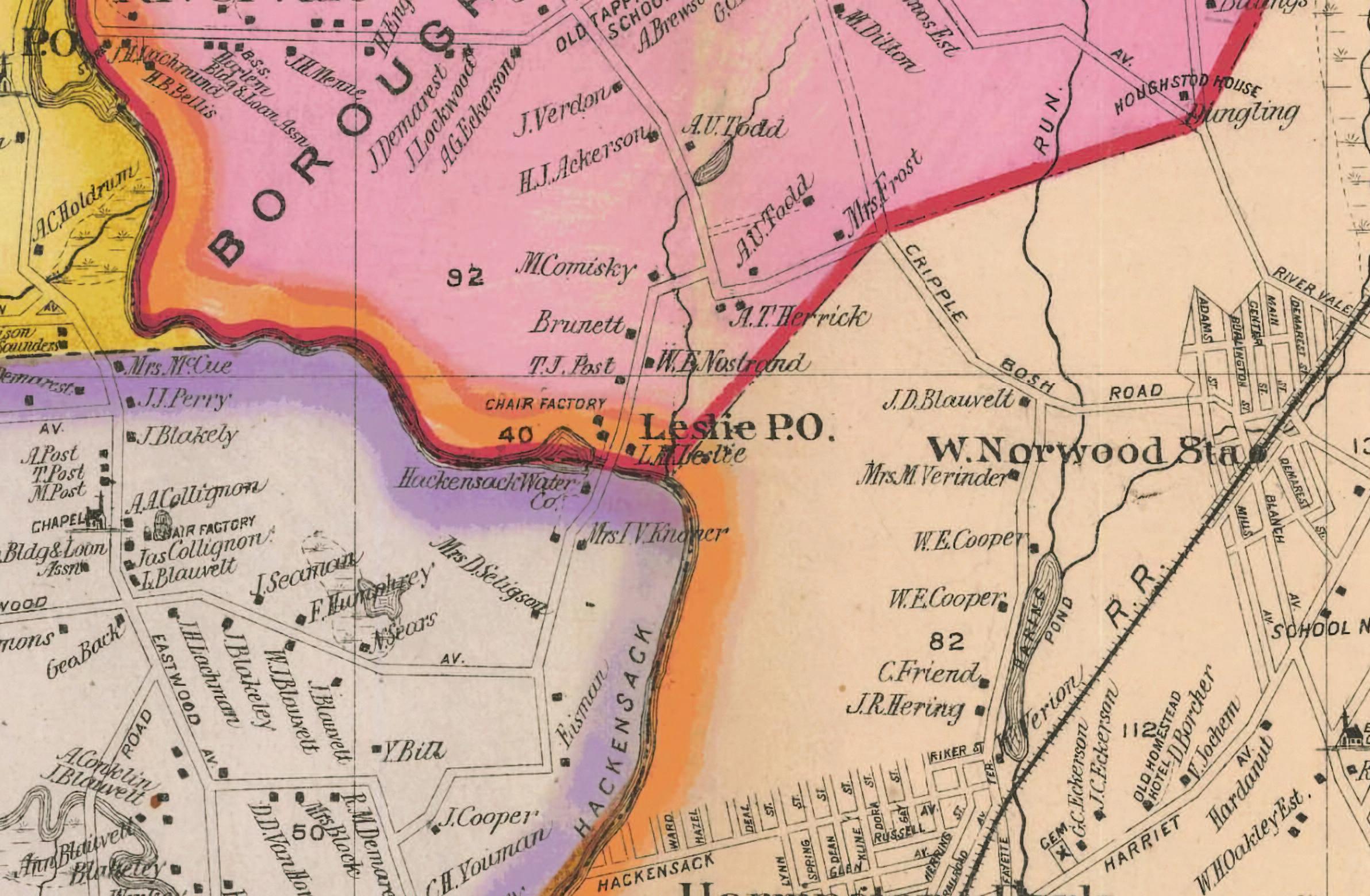 described as running “from Westwood, through Old Hook, to Bogertʼs Mills, Eastwood, Leslie, River Vale, and Old Tappan.” The 1905 New Jersey Census lists Leslieʼs profession as inventor. He devoted years to perfecting an innovation still in daily use: the loose-leaf binder.
