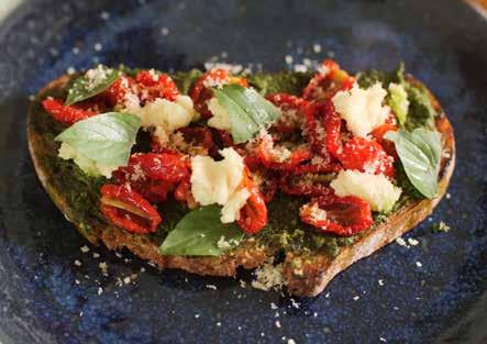3 Add the tomato salsa, rocket, macadamia ricotta, and pine nuts on toast.