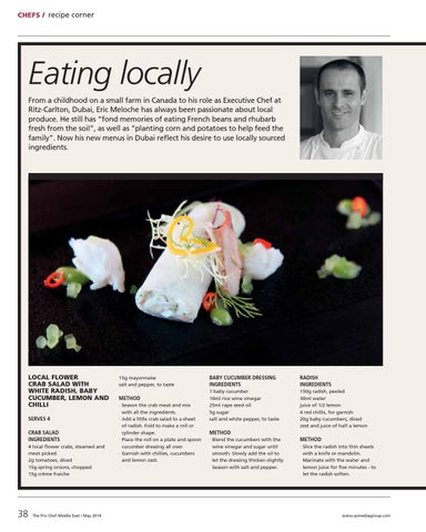 Eating locally From a childhood on a small farm in Canada to his role as Executive Chef at Ritz-Carlton, Dubai, Eric Meloche has always been passionate about local produce. He still has “fond memories of eating French beans and rhubarb fresh from the soil”, as well as “planting corn and potatoes to help feed the family”. Now his new menus in Dubai reflect his desire to use locally sourced ingredients.