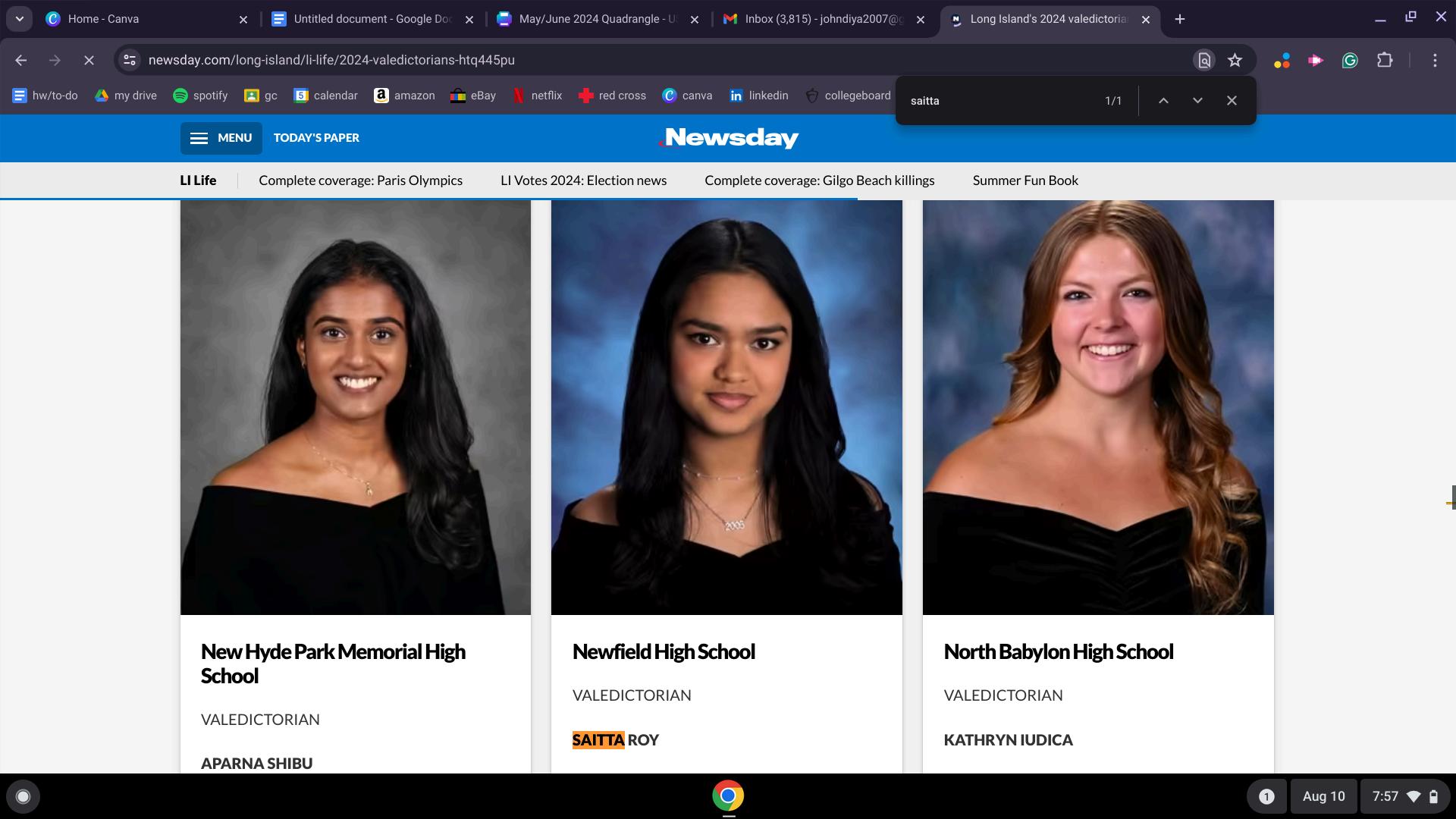 Newfield’s Valedictorian for the Class of 2024 is Saitta Roy. She will graduate in June with over 30 college credits, she has taken over 10 AP courses throughout her time in high school. She is involved in various school events and holds leadership positions in many clubs. Saitta is the founder and president of Crochet Club, president of The Quadrangle, president of the National Honor Society, lawyer in Mock Trial, vice president of the Tri-M Honor Society, member of Pit Orchestra, member of Dr. Roberta Gerold’s Leadership Club, and member of the Middle Country Legislative/Outreach Community Committee. Outside of school, Saitta works at the Middle Country Public Library. She also used to volunteer as a tutor/homework pal and MCPL Book Buddy. Saitta also donated actively to Stony Brook Hospital with Crochet for a Cause. In the fall, she will attend the University of Notre Dame for mechanical engineering, on her way to law school to be a patent lawyer. Congratulations Saitta!