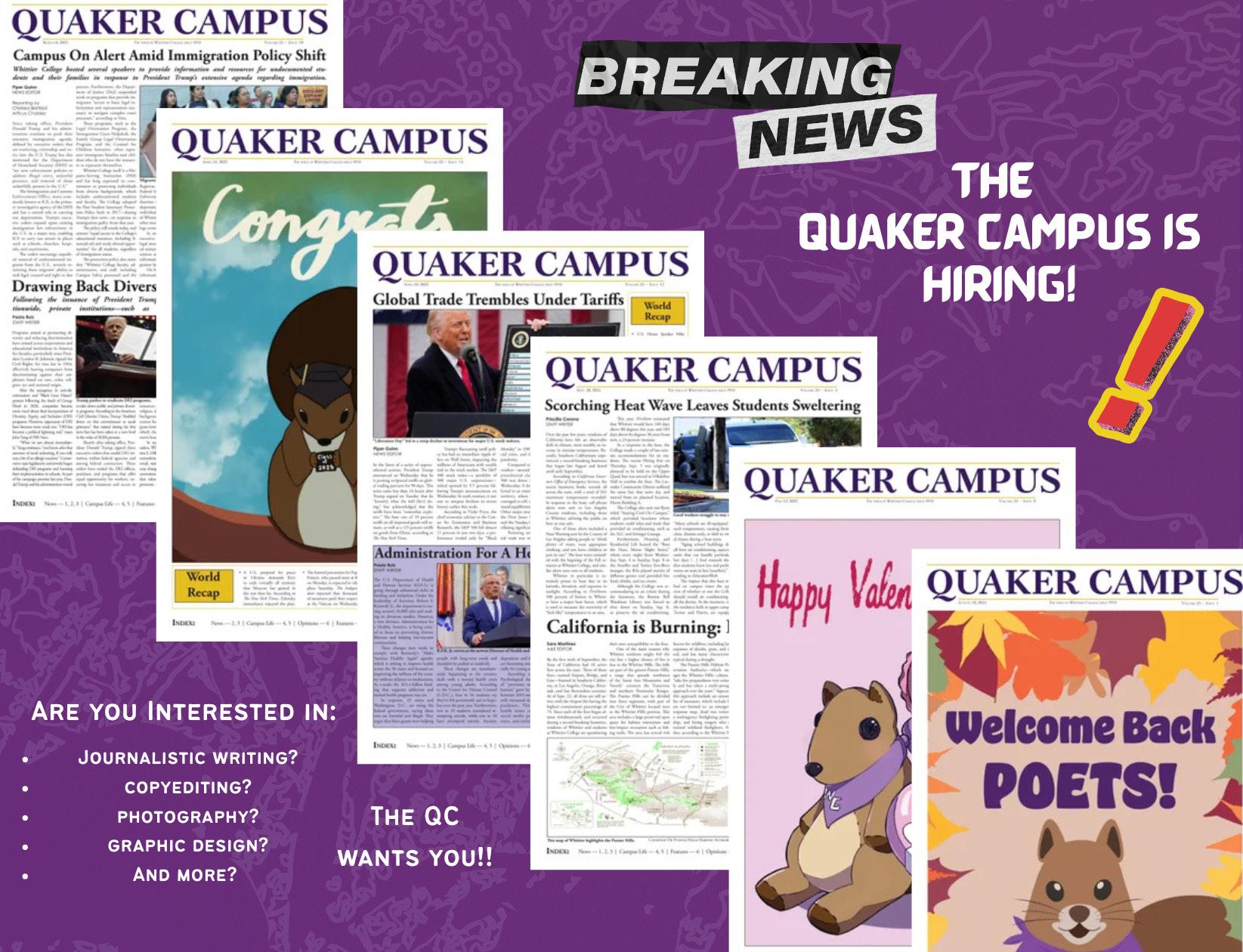 The Quaker Campus does not change material posted on online articles once they have been published in the paper — with the exception of an error being found. Only then will a correction be made to the online version. The Quaker Campus is a publication of Whittier College. Columns and Signed editorials do not necessarily reflect the opinions of Whittier College or its affiliates.
