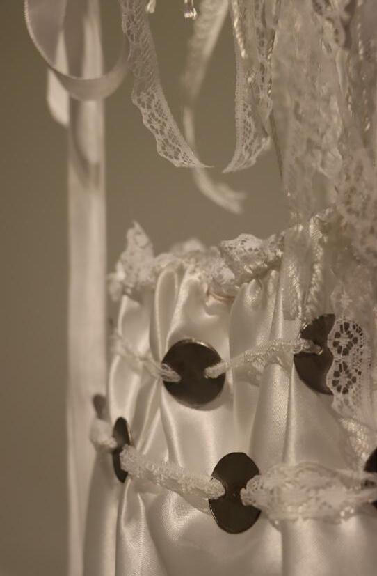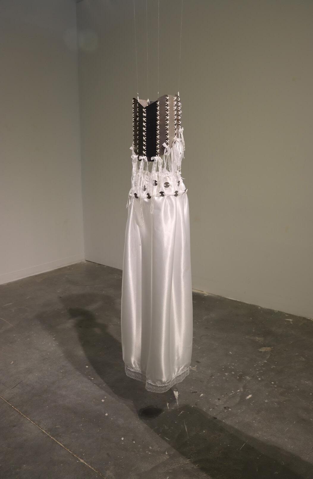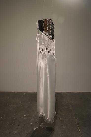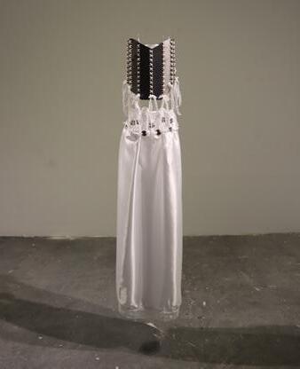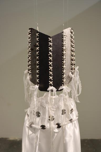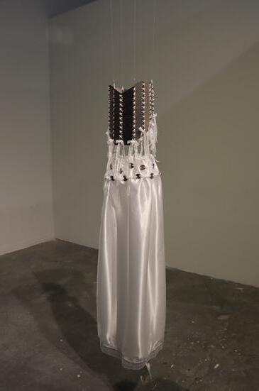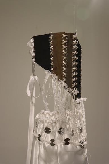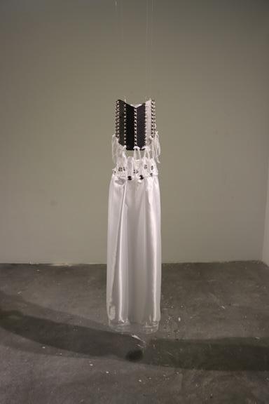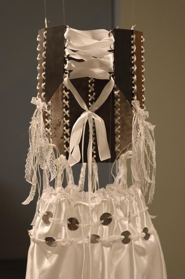 The piece consists of a corset made from discarded metal and a satin skirt adorned with roughly cut metal—contrasting the harshness of rust and degradation with delicate, pure white textiles.