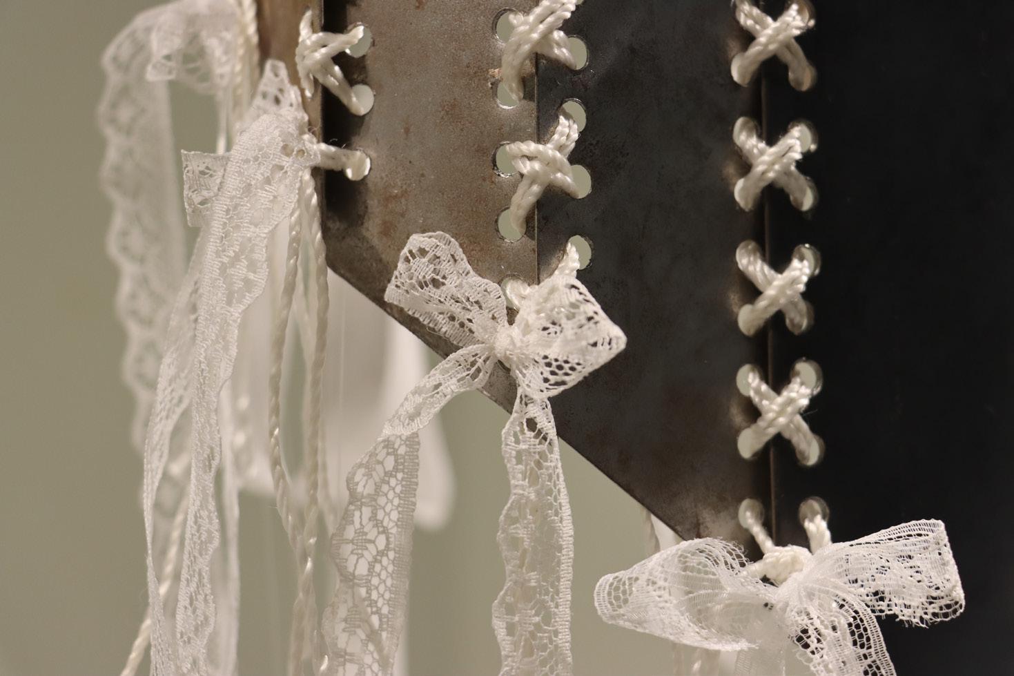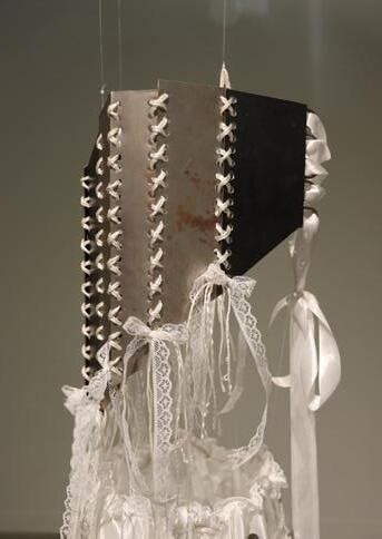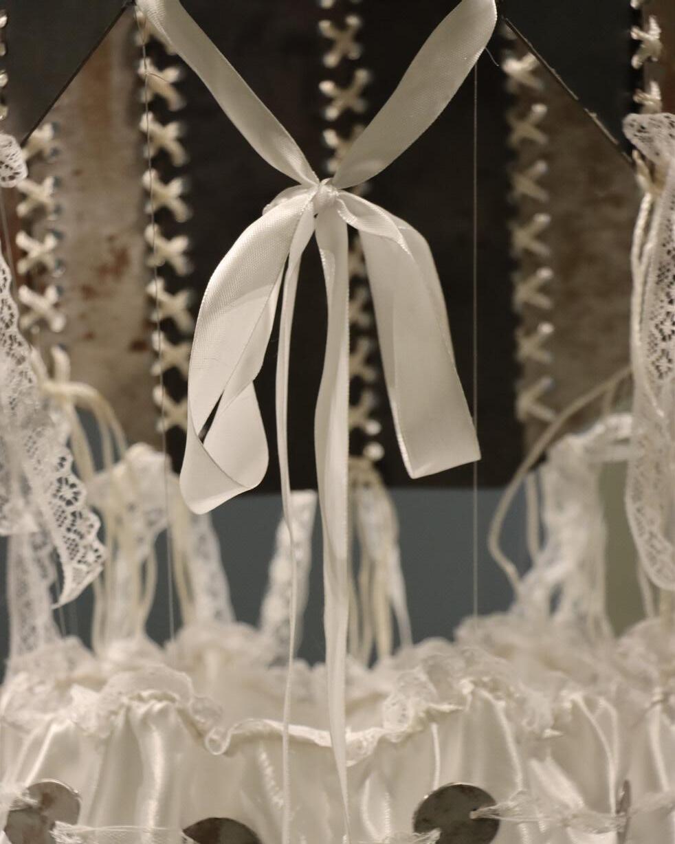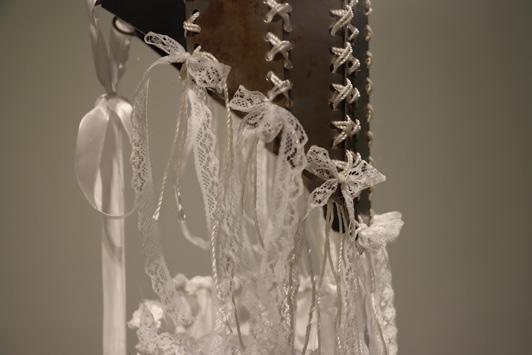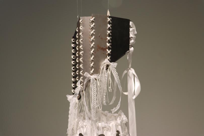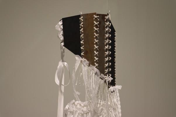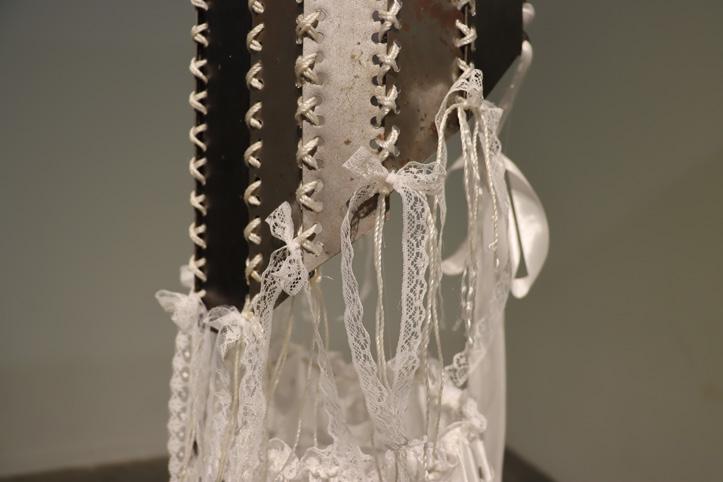 The piece consists of a corset made from discarded metal and a satin skirt adorned with roughly cut metal—contrasting the harshness of rust and degradation with delicate, pure white textiles.