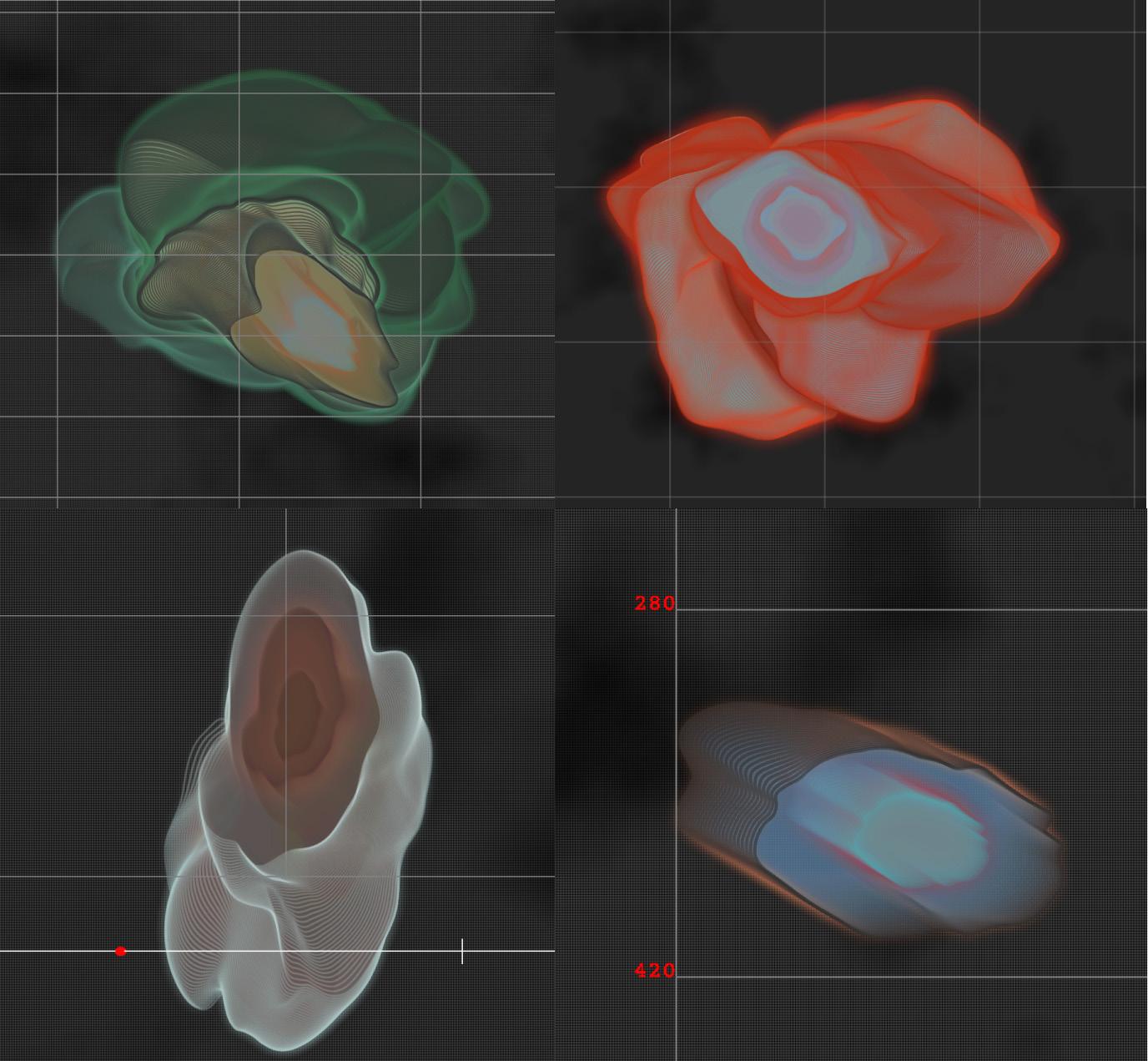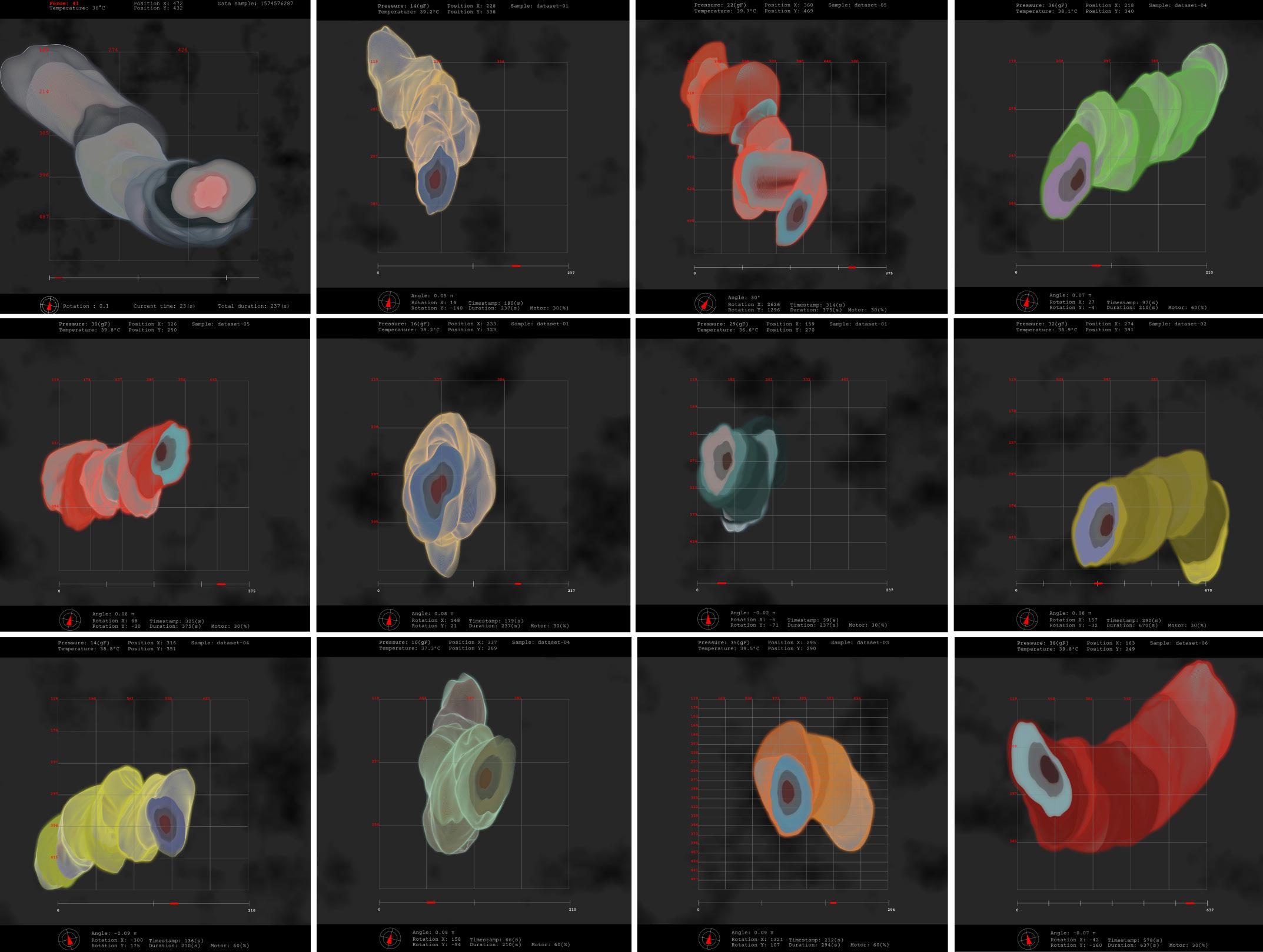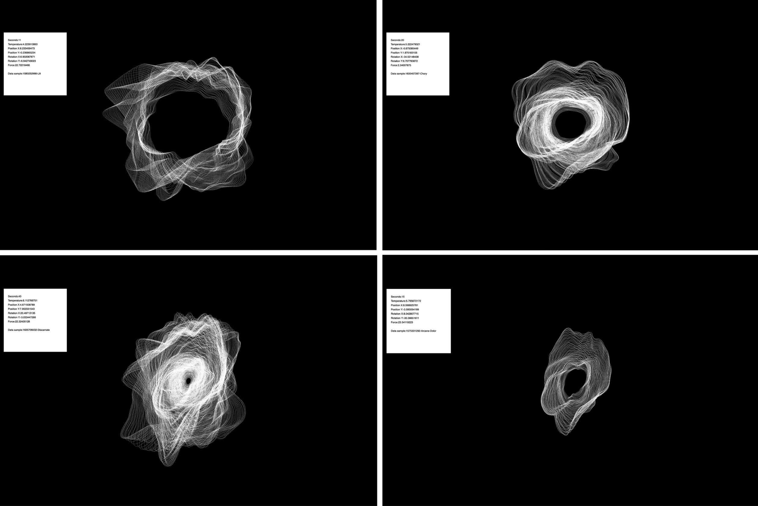 generative art collection (2023) developed by translating an auto erotic act into a visual experience using the data gathered from testing sessions of the Smart vibrator device. Each visual shape represents a portion of 15 seconds per each session and is self-generated by reading data such as body temperature, device pressure, and position through time.