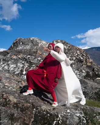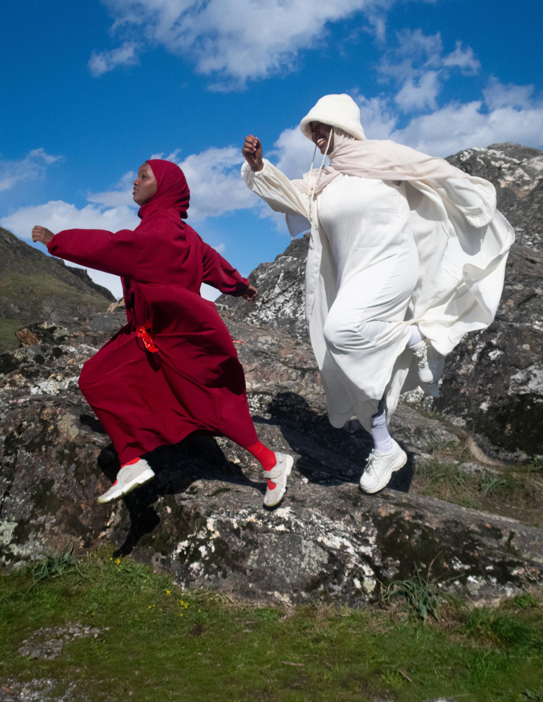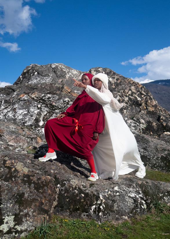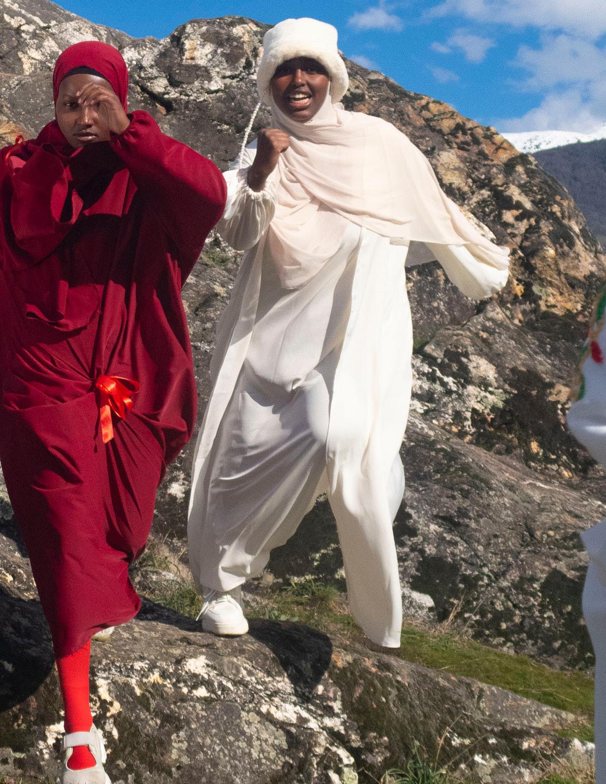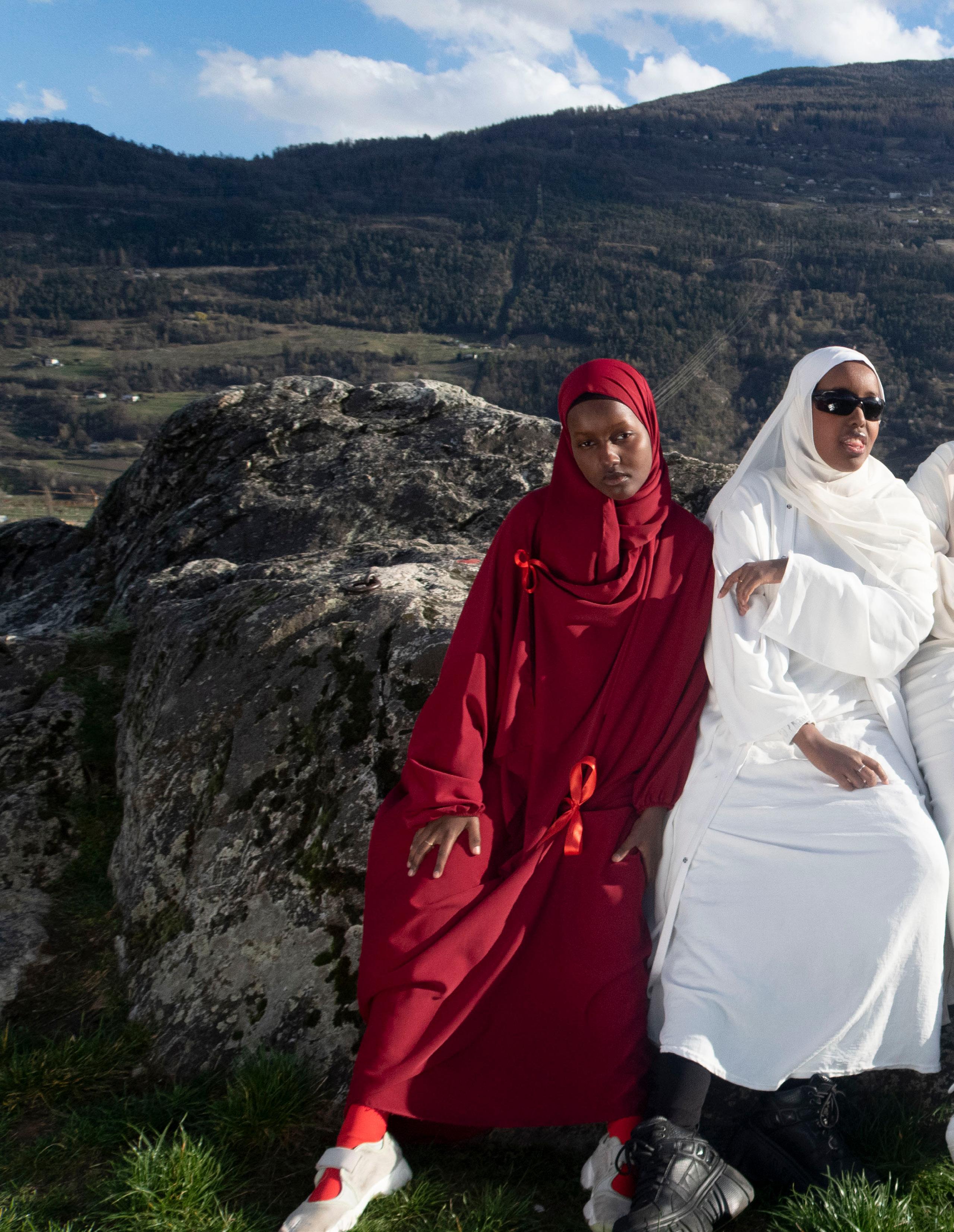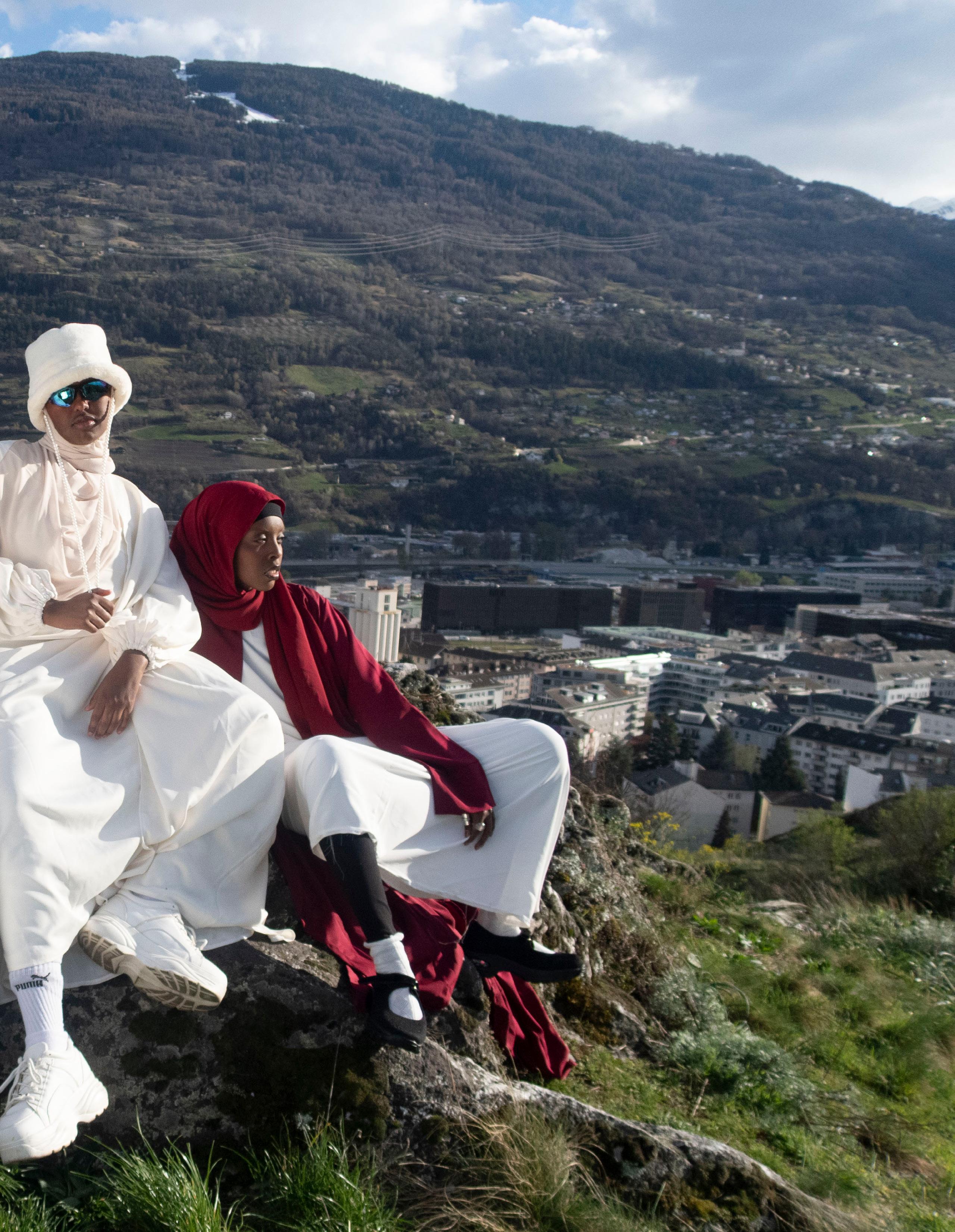 The shoot was inspired by the DAZED winter 2023 issue cover in honour of French Muslim women, representing colours of the Swiss flag through a politicised piece of clothing: abayas. These Black Hijabi women show that they also are the contemporary Heidi. To further understand our identity and define our position in the Swiss public sphere, our [marginalised] gaze is put at the center and starts the deep work of defining our own reality and changing the current outdated norm through conversations archived in the format of a documentary.