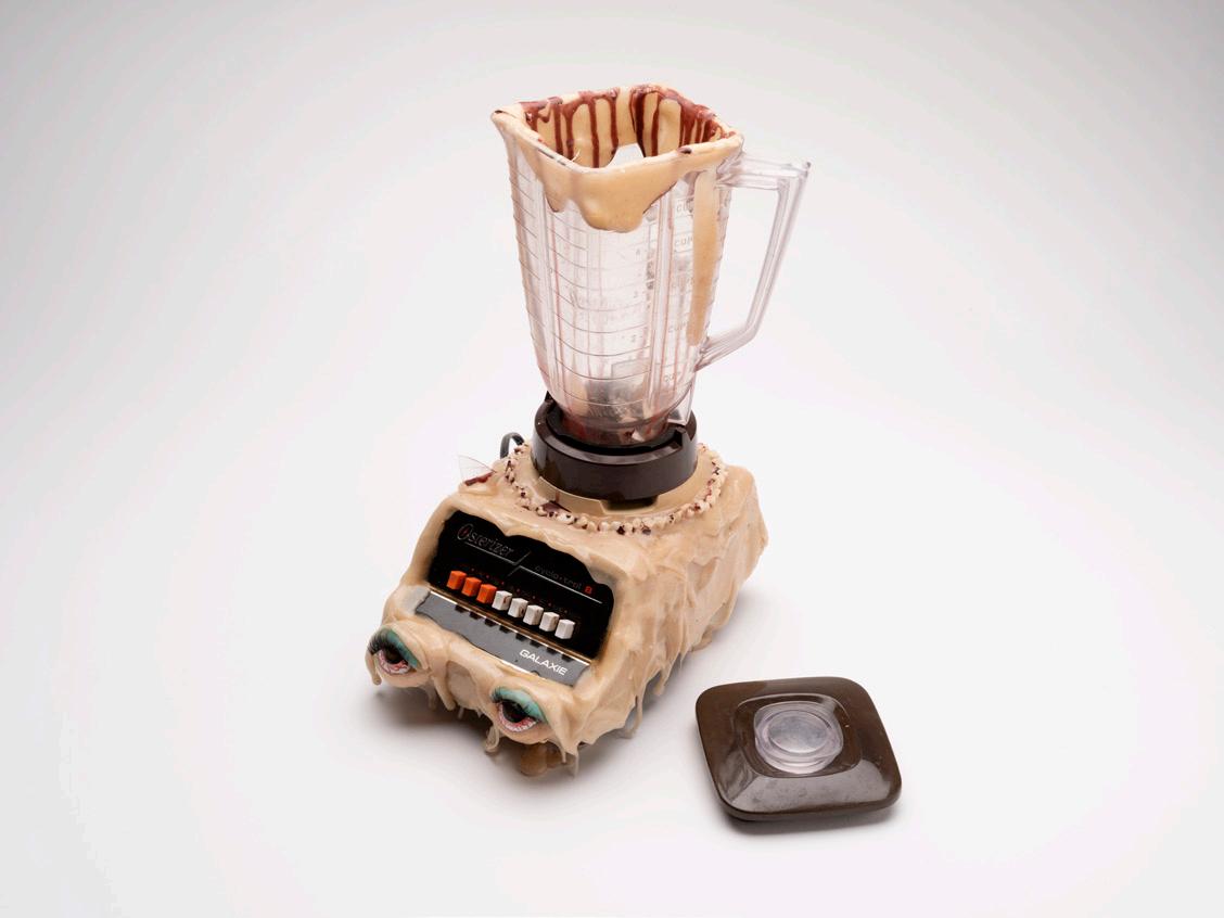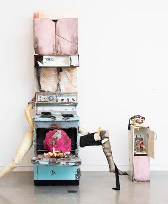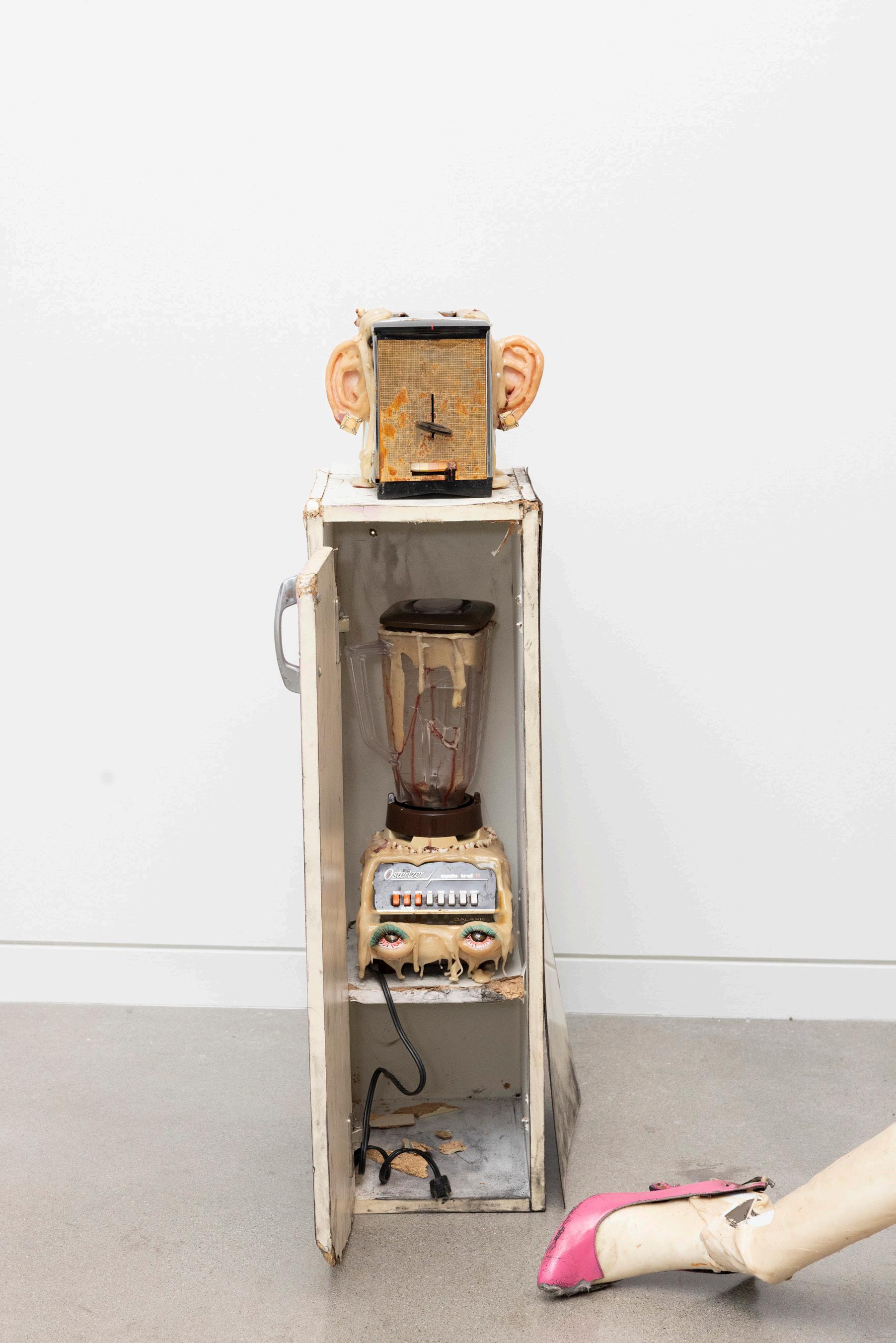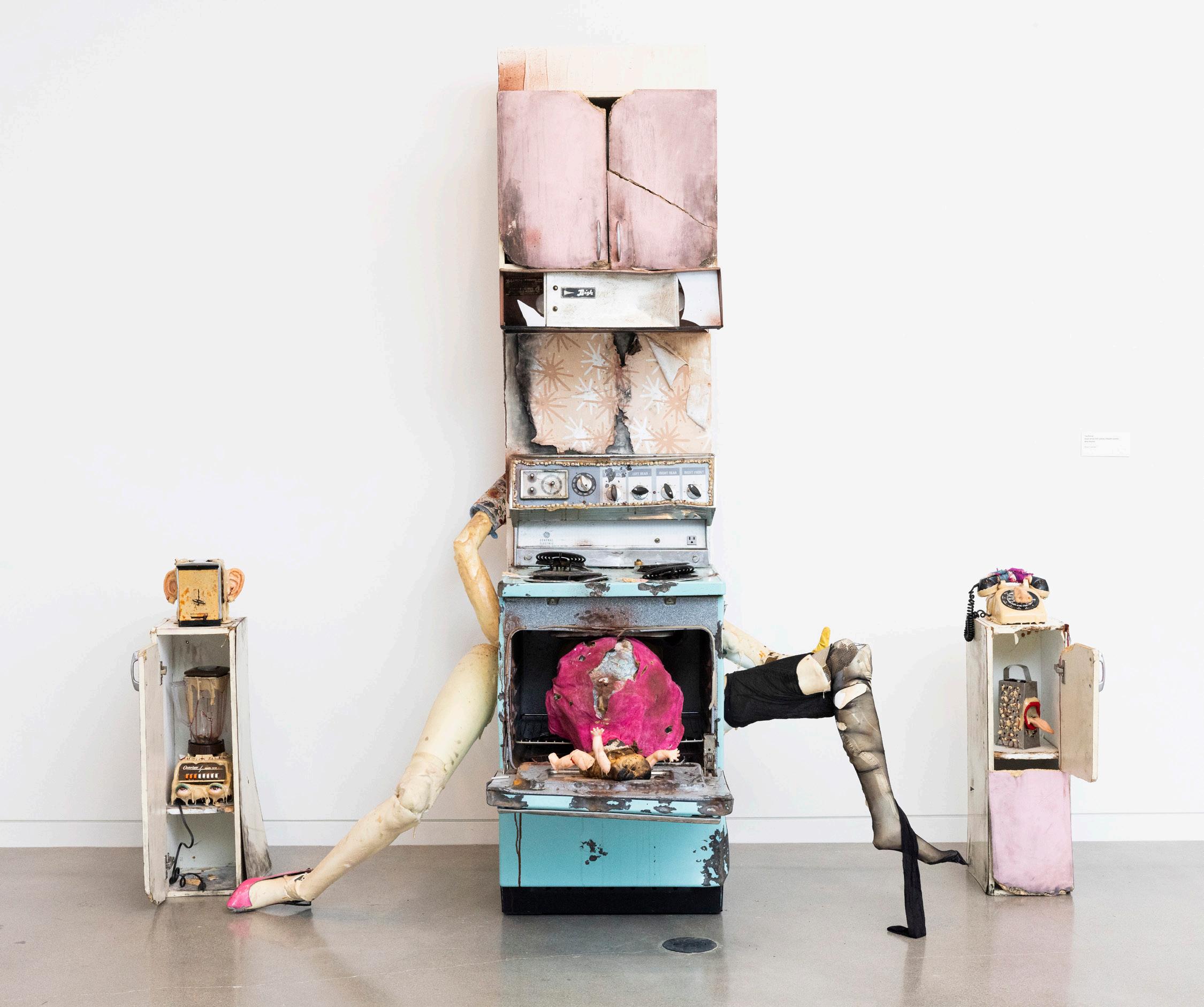 Assorted found appliances, mannequin parts, super sculpey, bioplastic, kitchen cabinetry, resin teeth, bread, crochet string, oven mitt, rubber glove, tights, high heel, apron, plywood, plaster, coffee grounds, cocoa powder, antiquing solution, contact paper, acrylic paint