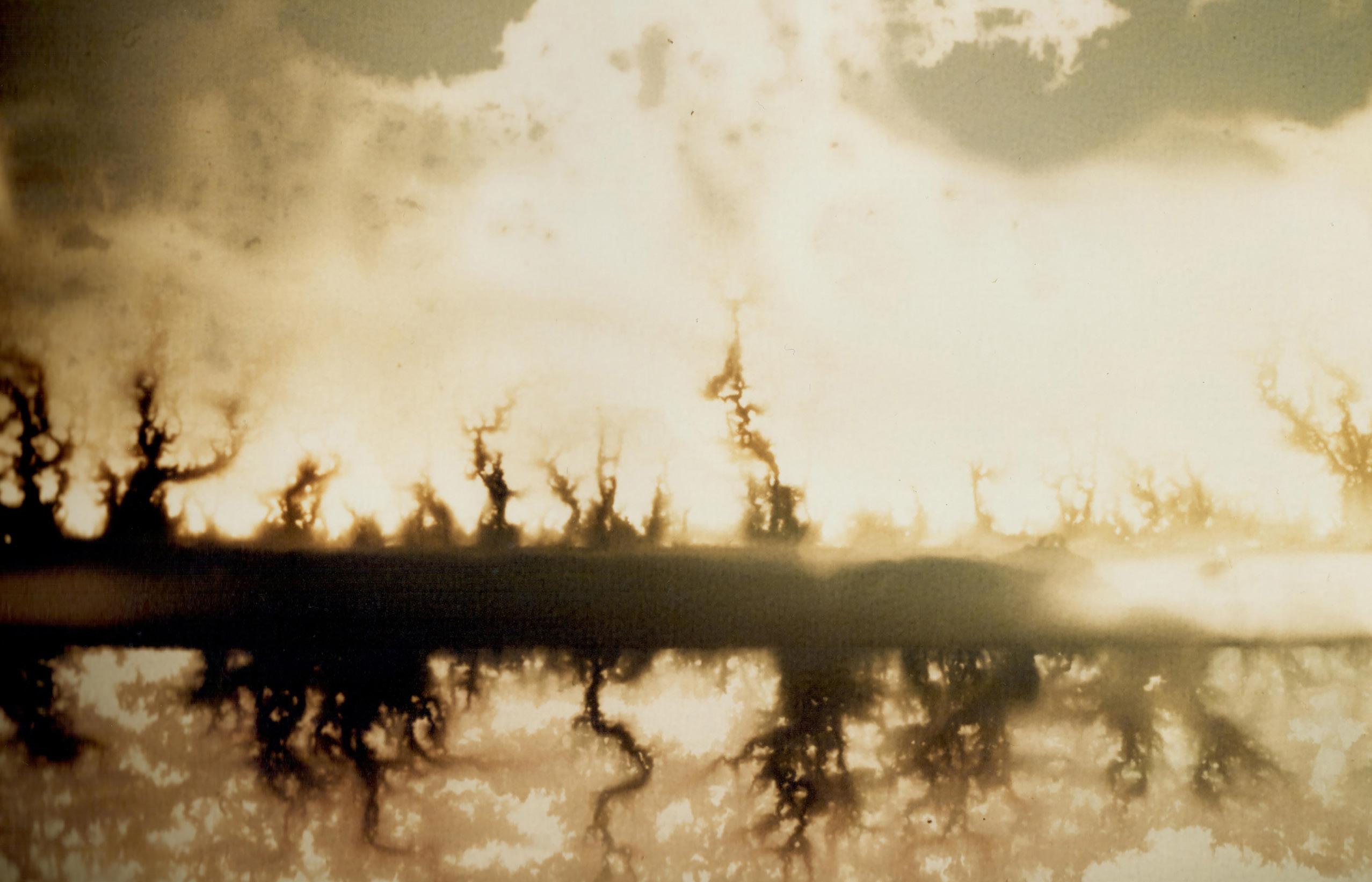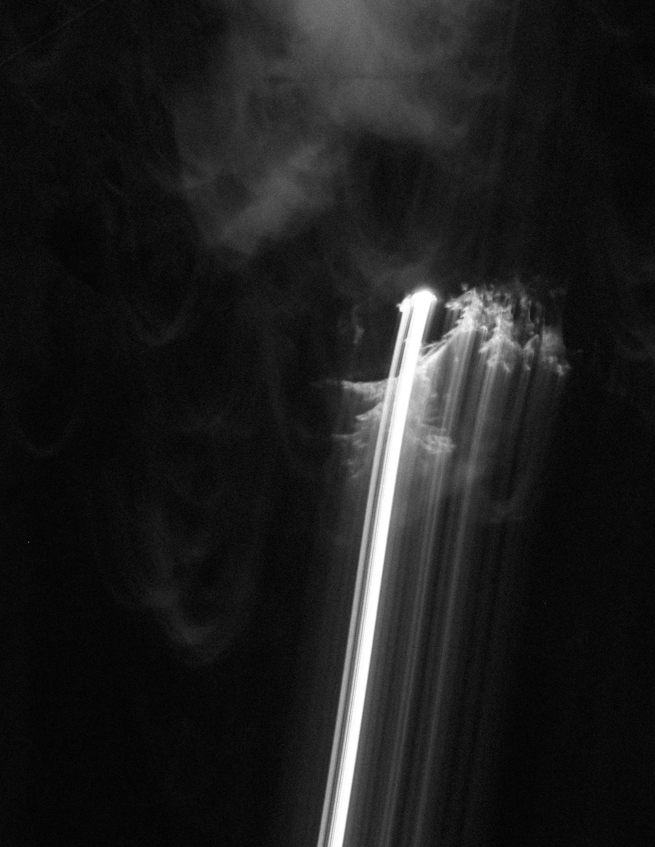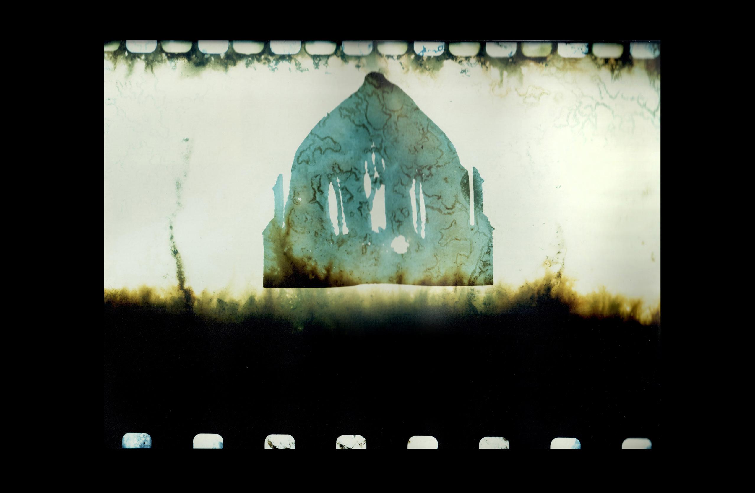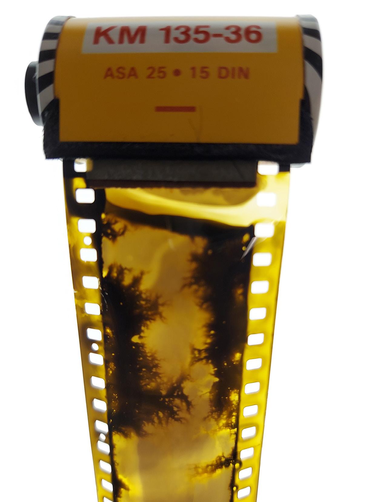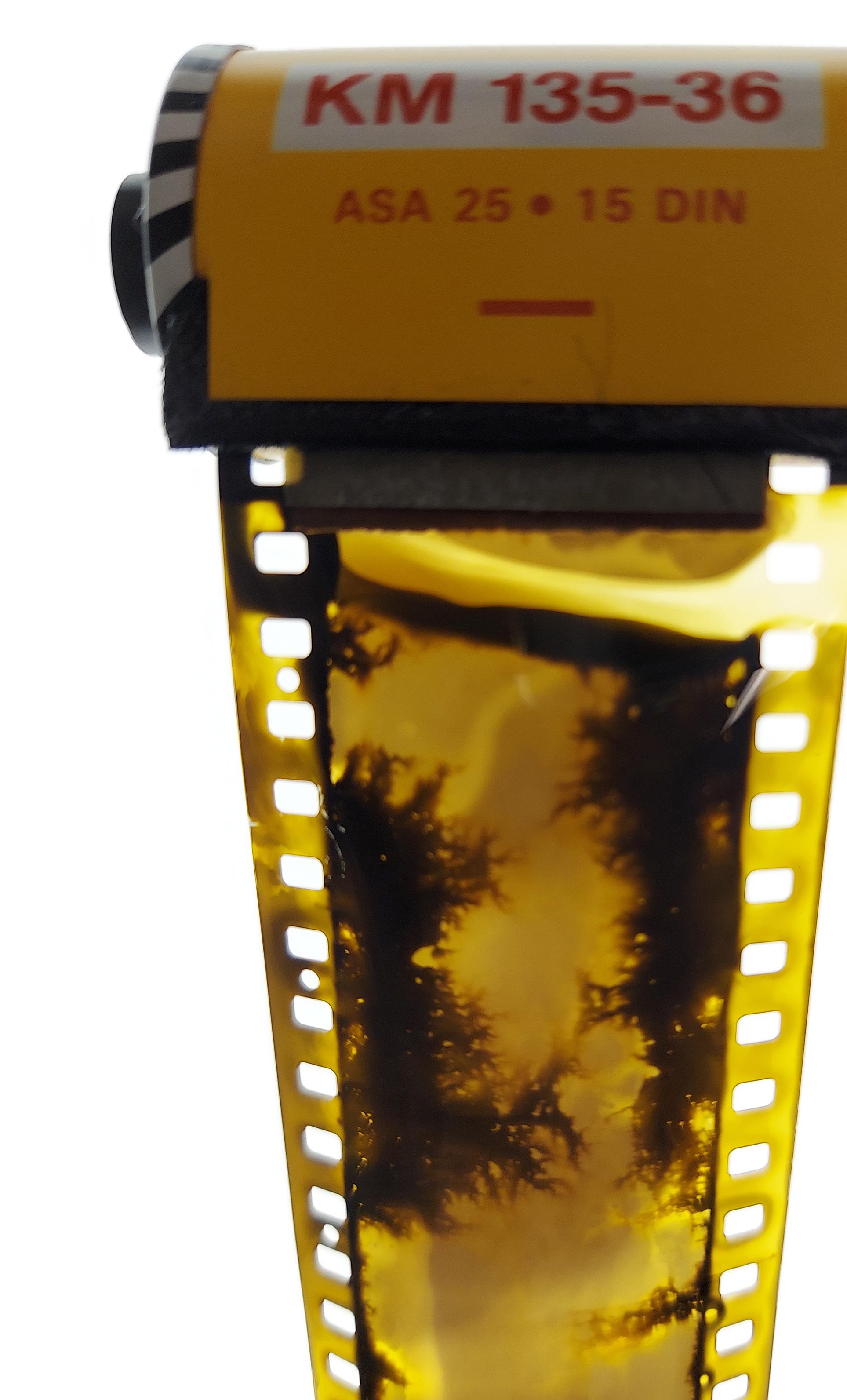 By spraying, then gliding traditional darkroom chemicals onto the surface of photographic film, the liquids crystallize, blacken, and warp: all reacting with the photo emulsion. The films are presented as strips or in sections. It is a perverse treatment of the material since there is no lens or camera involved. It is not a reproduction, but enlightening what is latent; written with accidents.