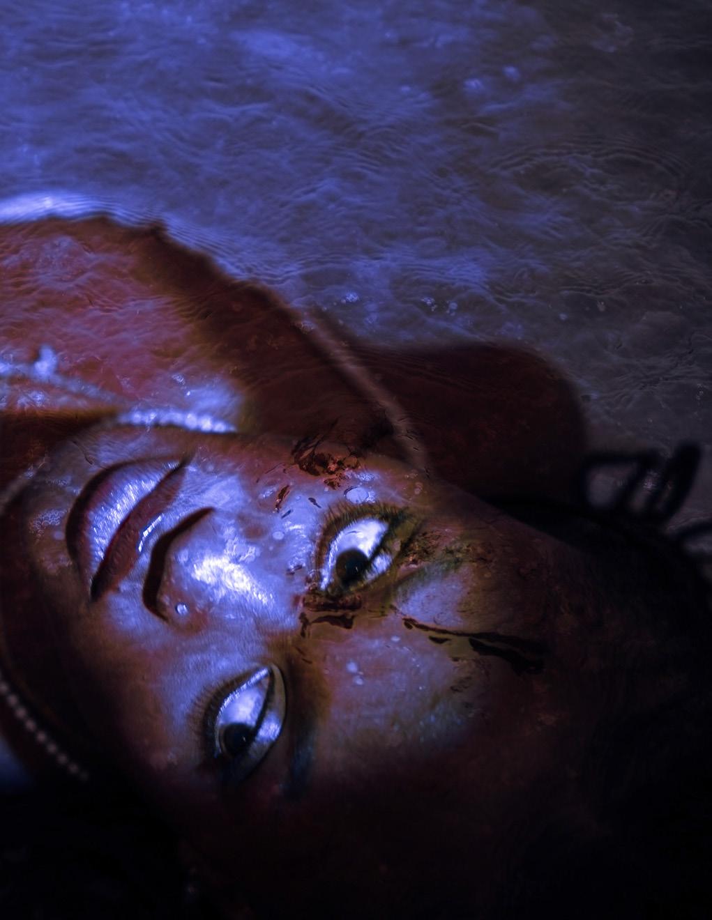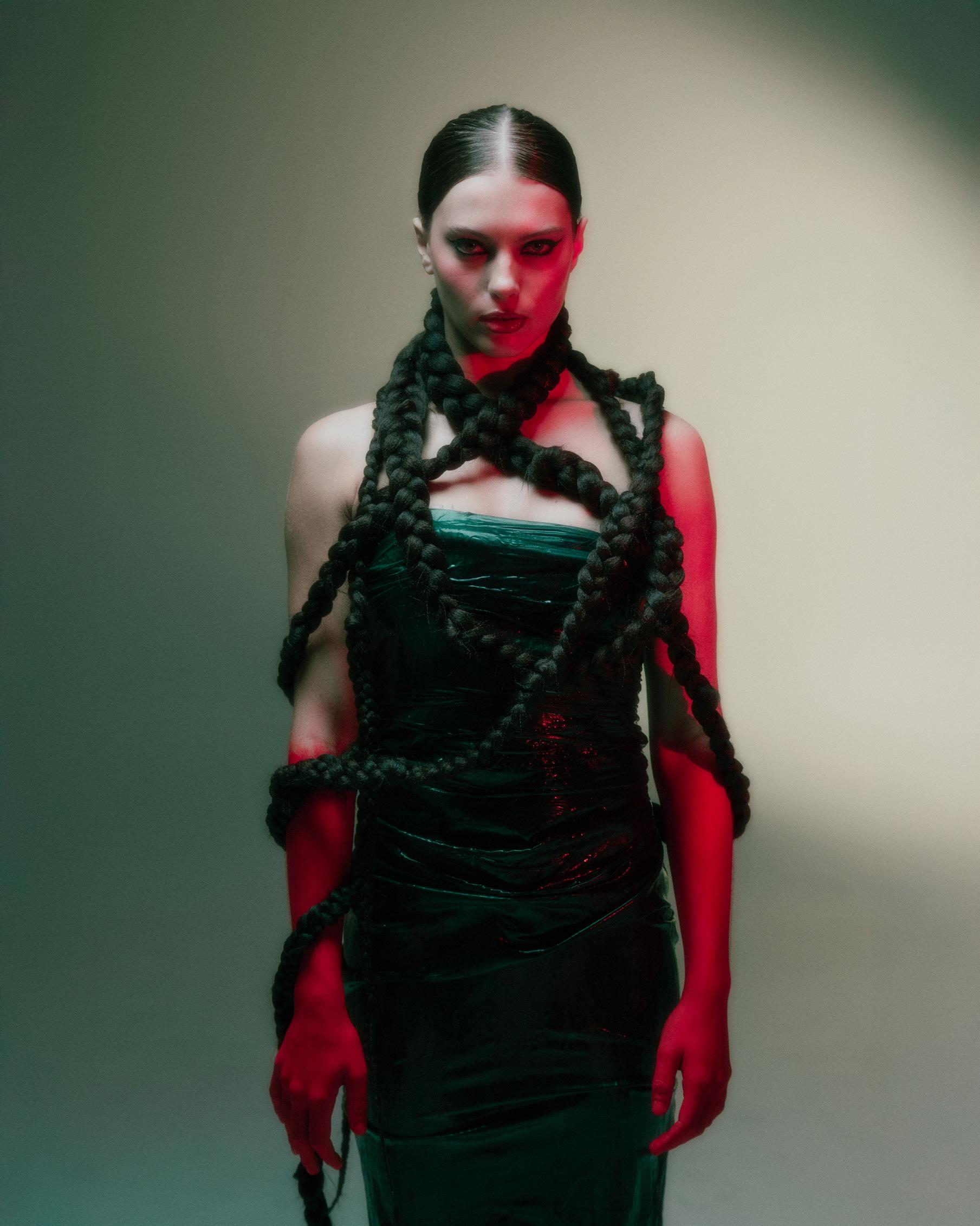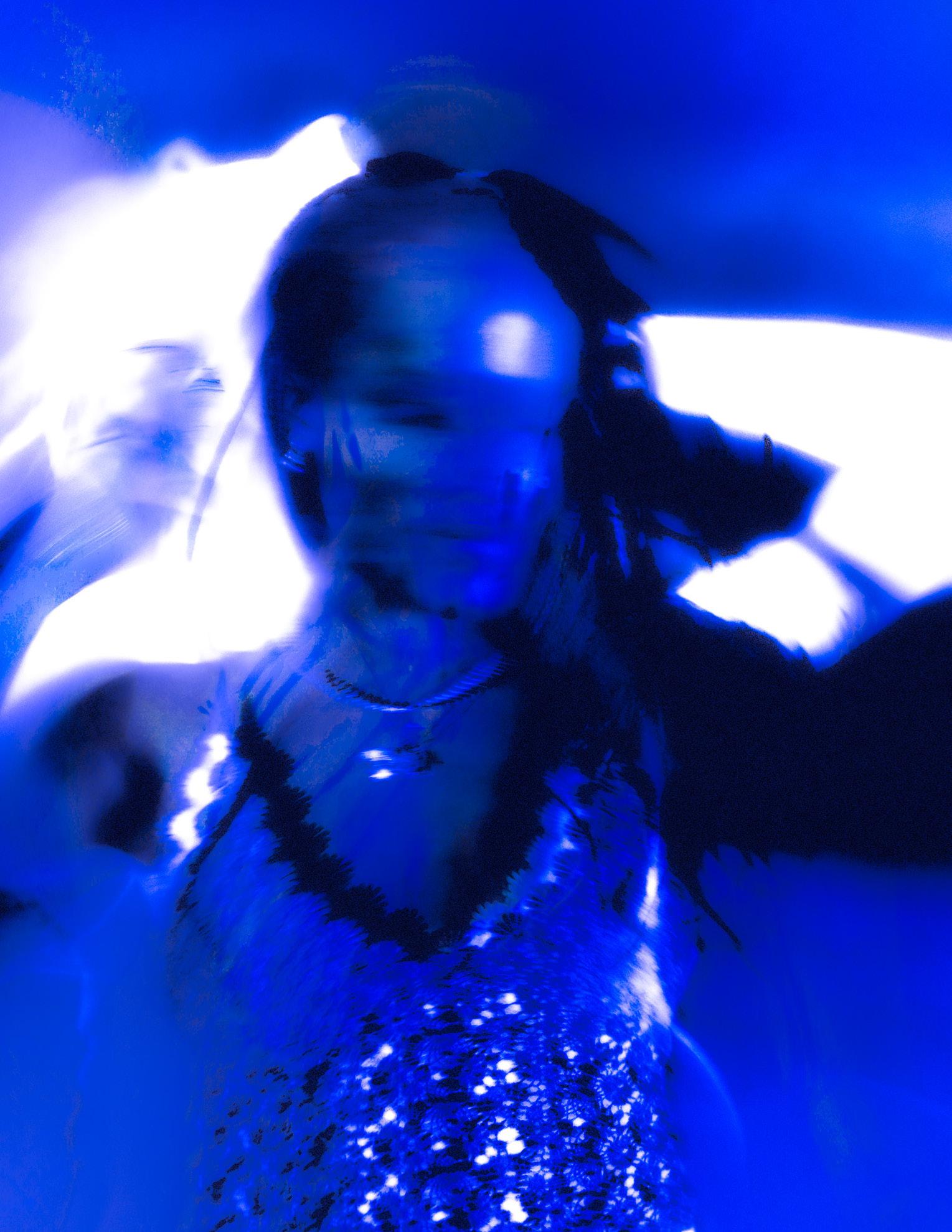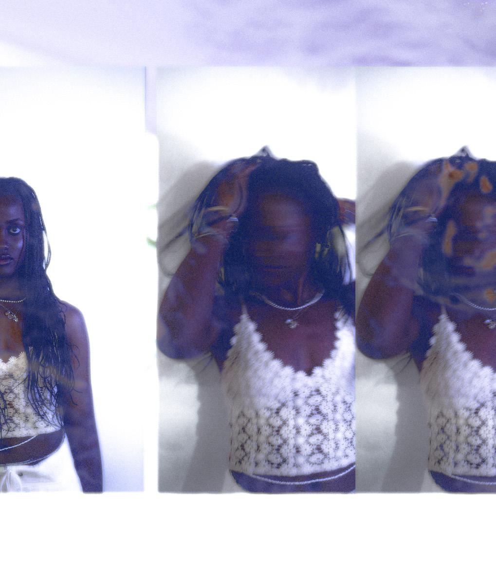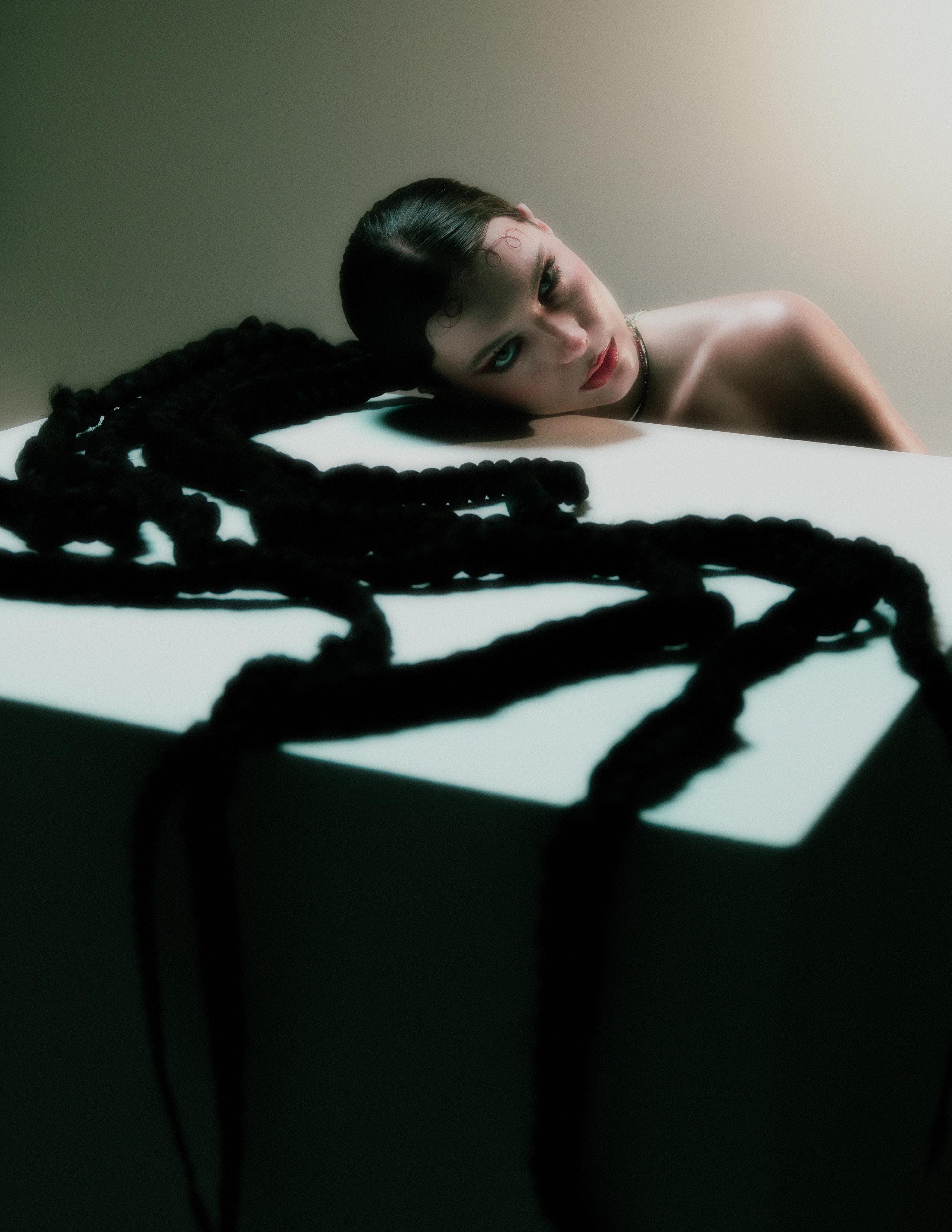 Each photograph functions as a thread weaving through a dreamlike state: a girl entering the eye of the storm, surrendering to chaos, merely existing in an ephemeral trance. In this ethereal world, she harnesses the divine feminine, flowing with the waves, holding remnants of stars in her palms and on her skin.