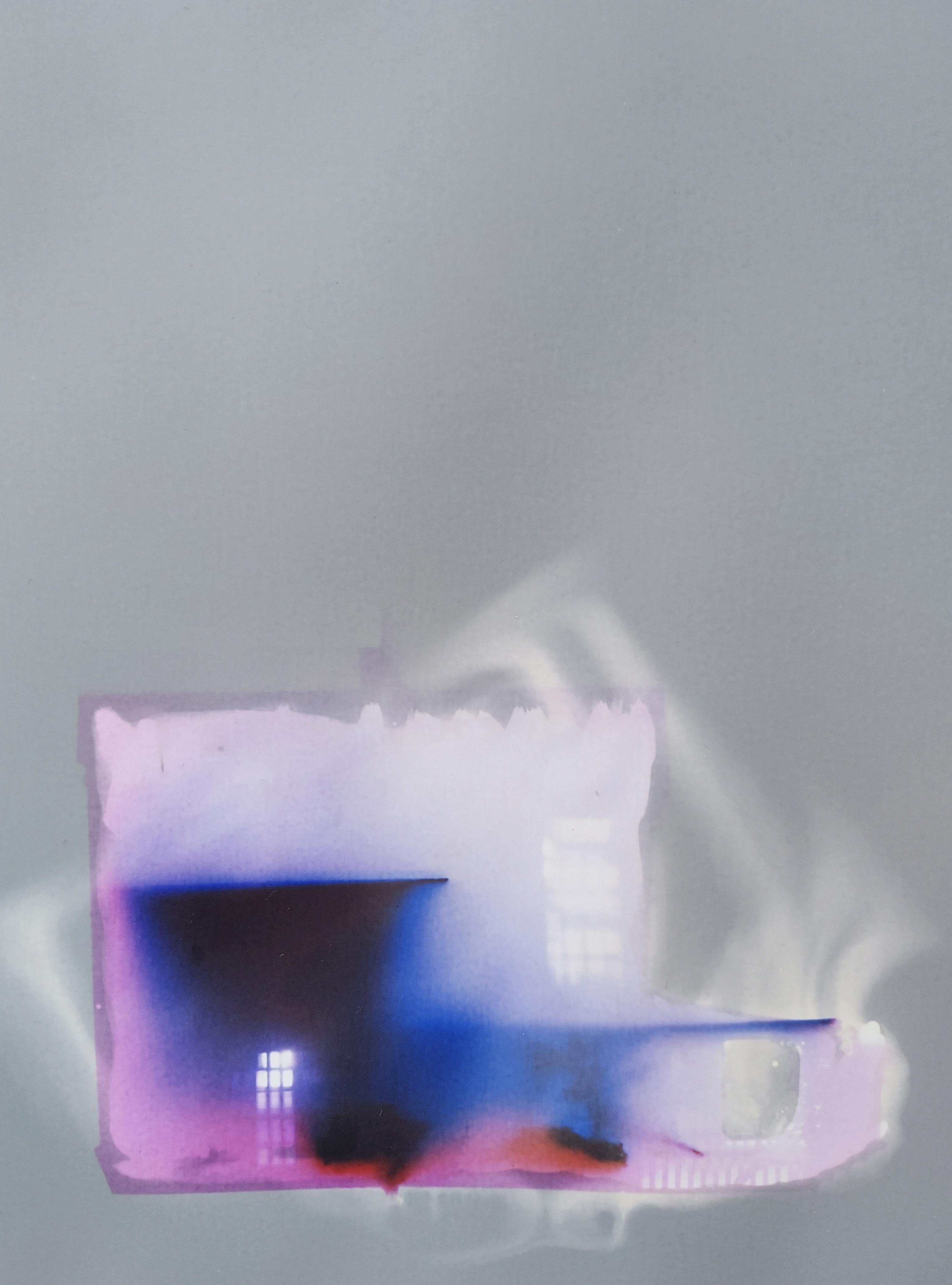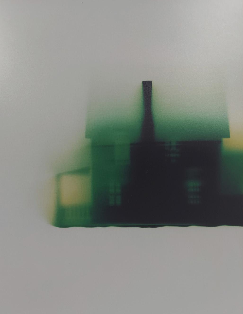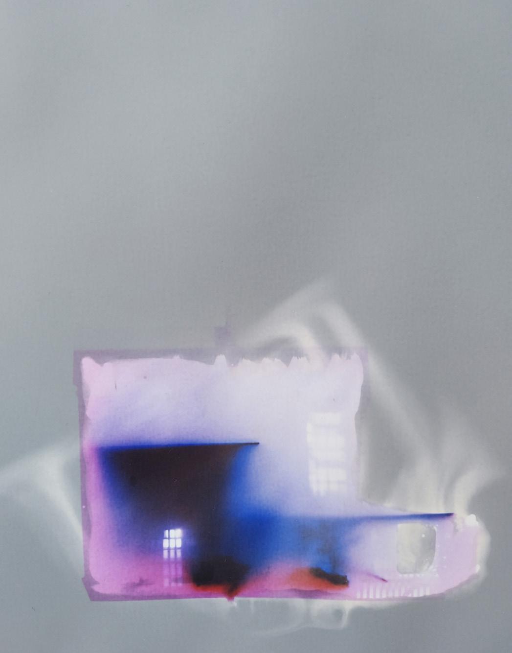 The prints of the miniature houses are photograms, placed on unexposed color photo paper and captured without the use of a camera or lens.