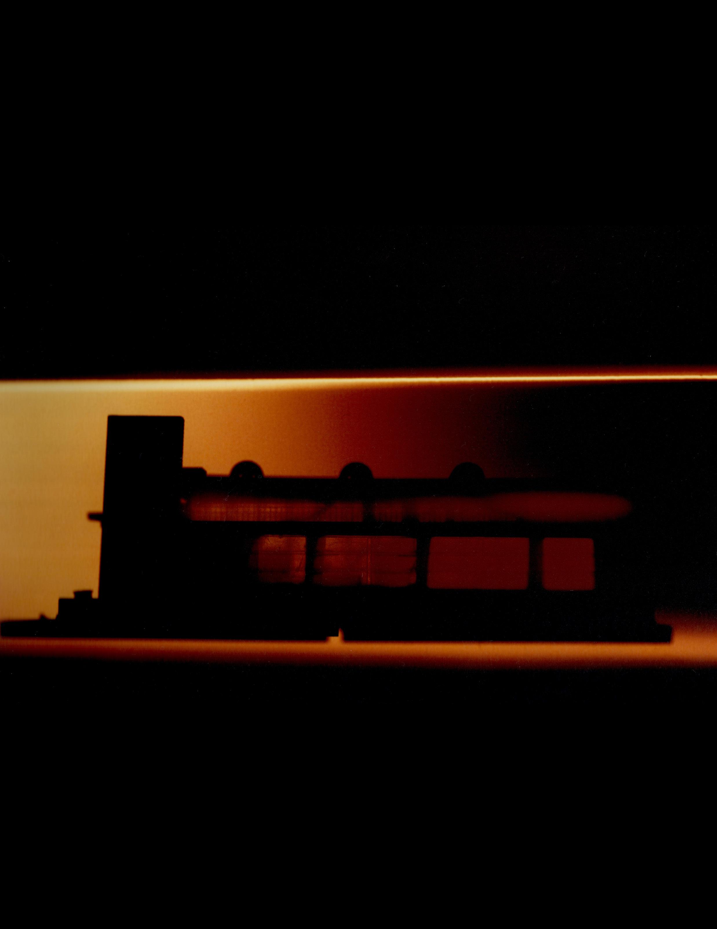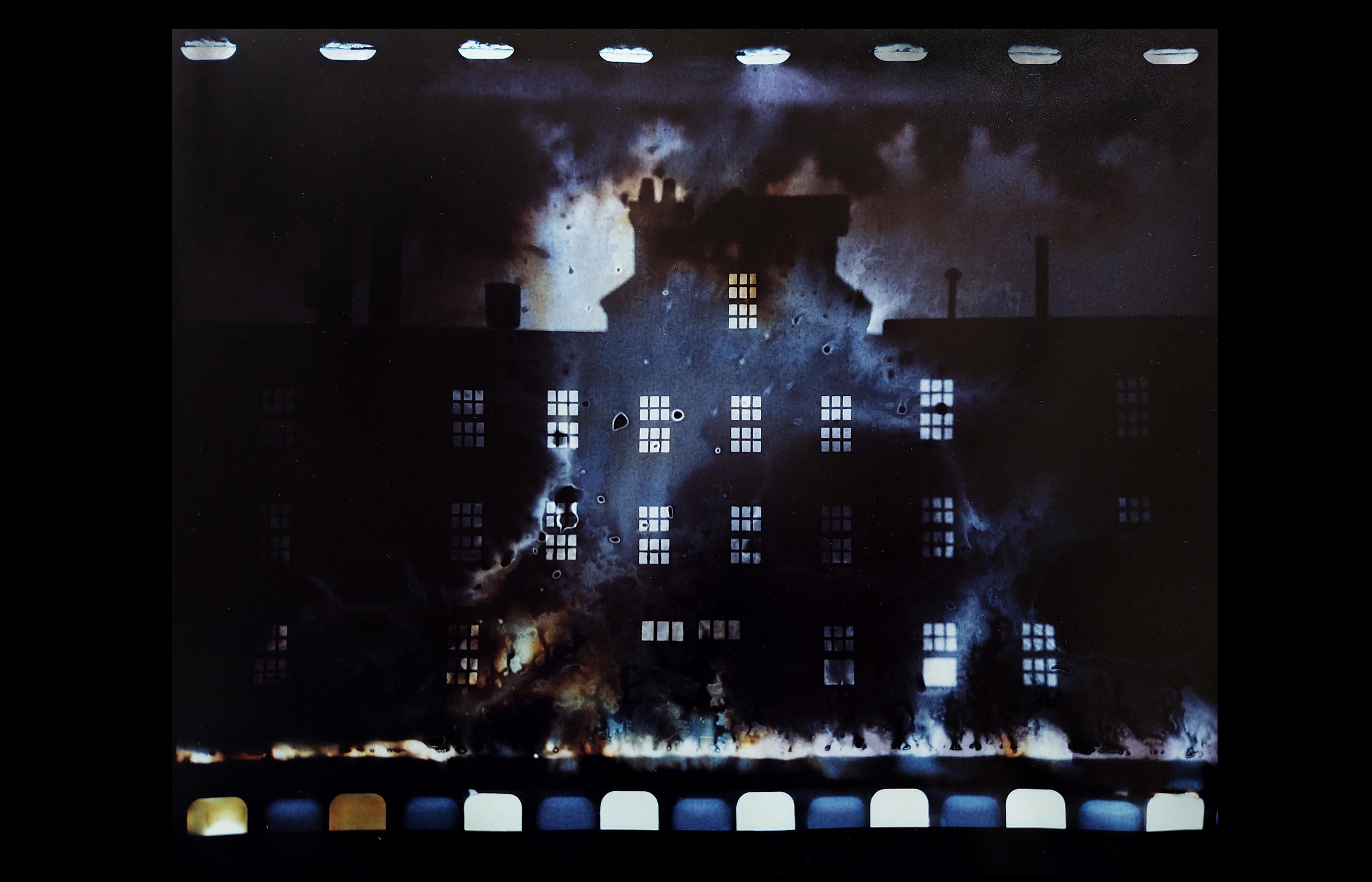 Each image is unique: the structure of the house is the same, but the gradations of color and shadows are different. They are not only done with RA-4 color chemistry, but they utilize a reversal process, so that the resulting images are positive. They may appear to be flat, or have empty interiors, yet the light shines through with degrees of both menace and revelation.