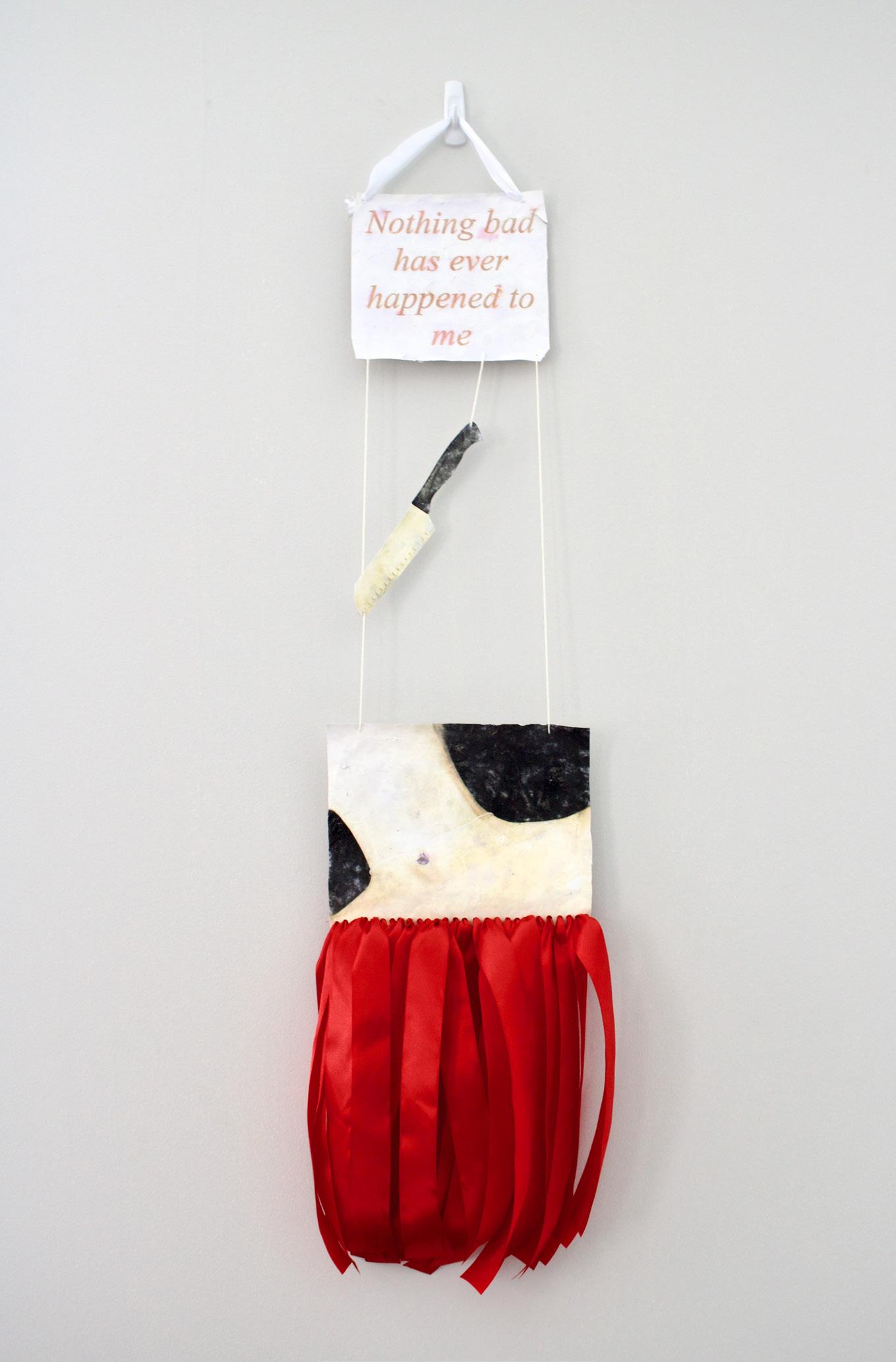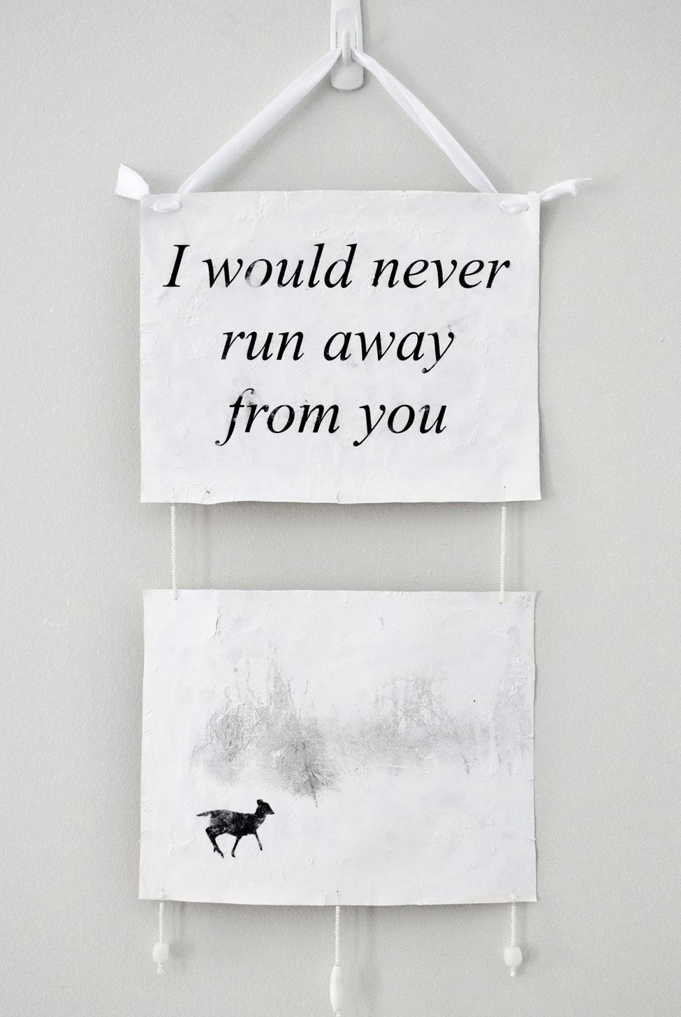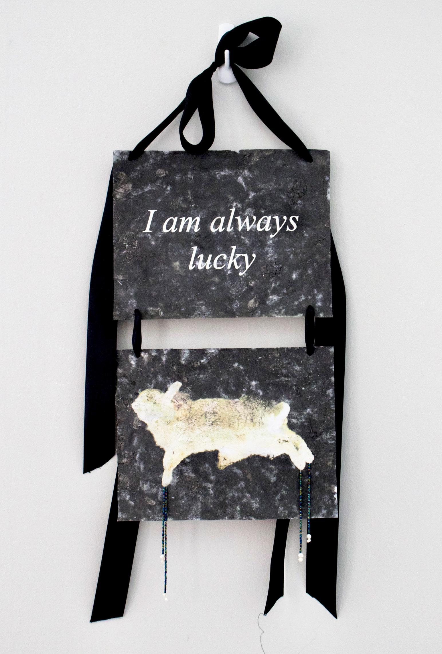The trilogy of wall hangings are presented here in order. First, “I would never run away from you,” also speaks to a specific individual from my point of view, but is additionally an untrue statement meant to deceive another on how I function relationally. The second in the series, “I am always lucky,” reads both as an affirmation and as a lie. The final work states that “nothing bad has ever happened to me”, which is also a lie, like the previous two works. In these three pieces, I transform lies into wishes, and marry the truth with deceit.