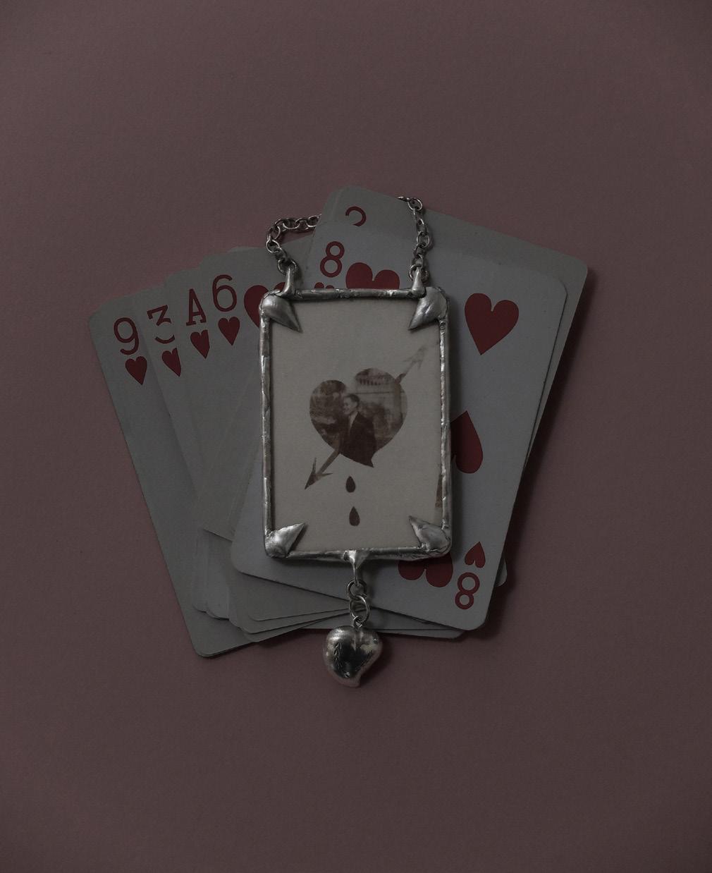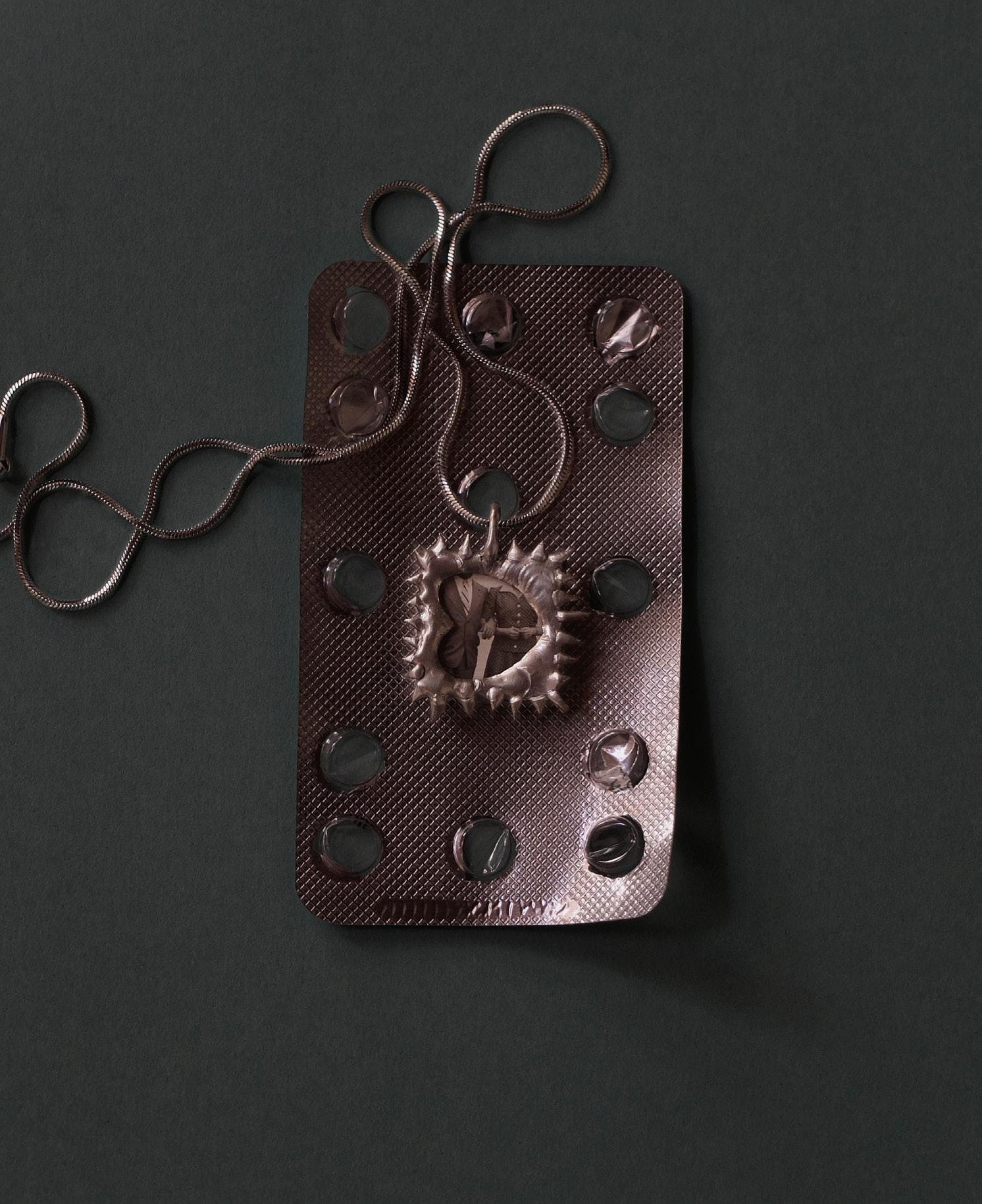 My pieces echo these contradictions. I craft love pendants that evoke tenderness but disrupt it with spikes – ornamental defenses that hint at the ways love can wound. And when it wounds, we all cope differently, often in toxic ways that only deepen the crisis: prescription pill use, casino gambling, endless nostalgia, naive romanticism, even obsessive self-help rituals. We cling to the fantasy while trying to medicate the fallout.