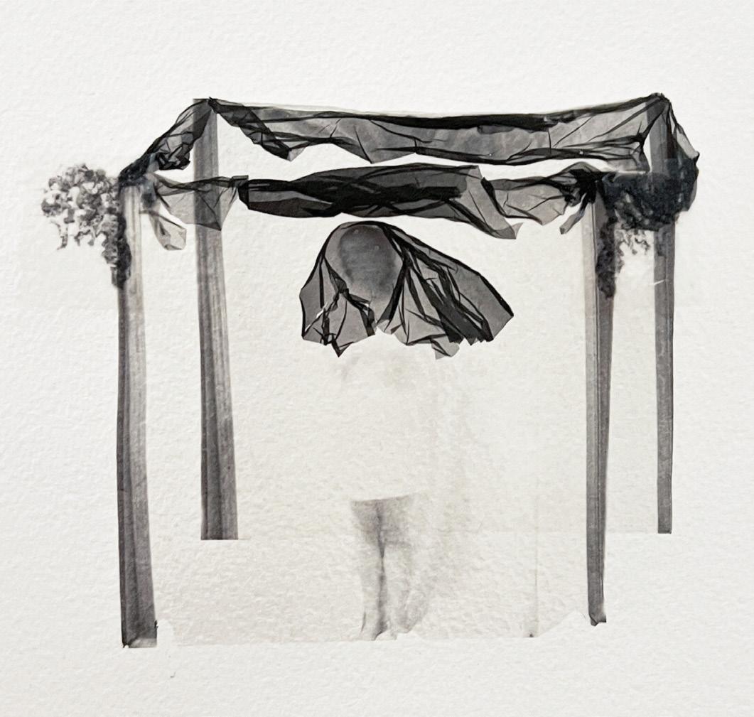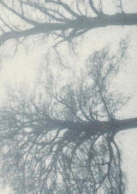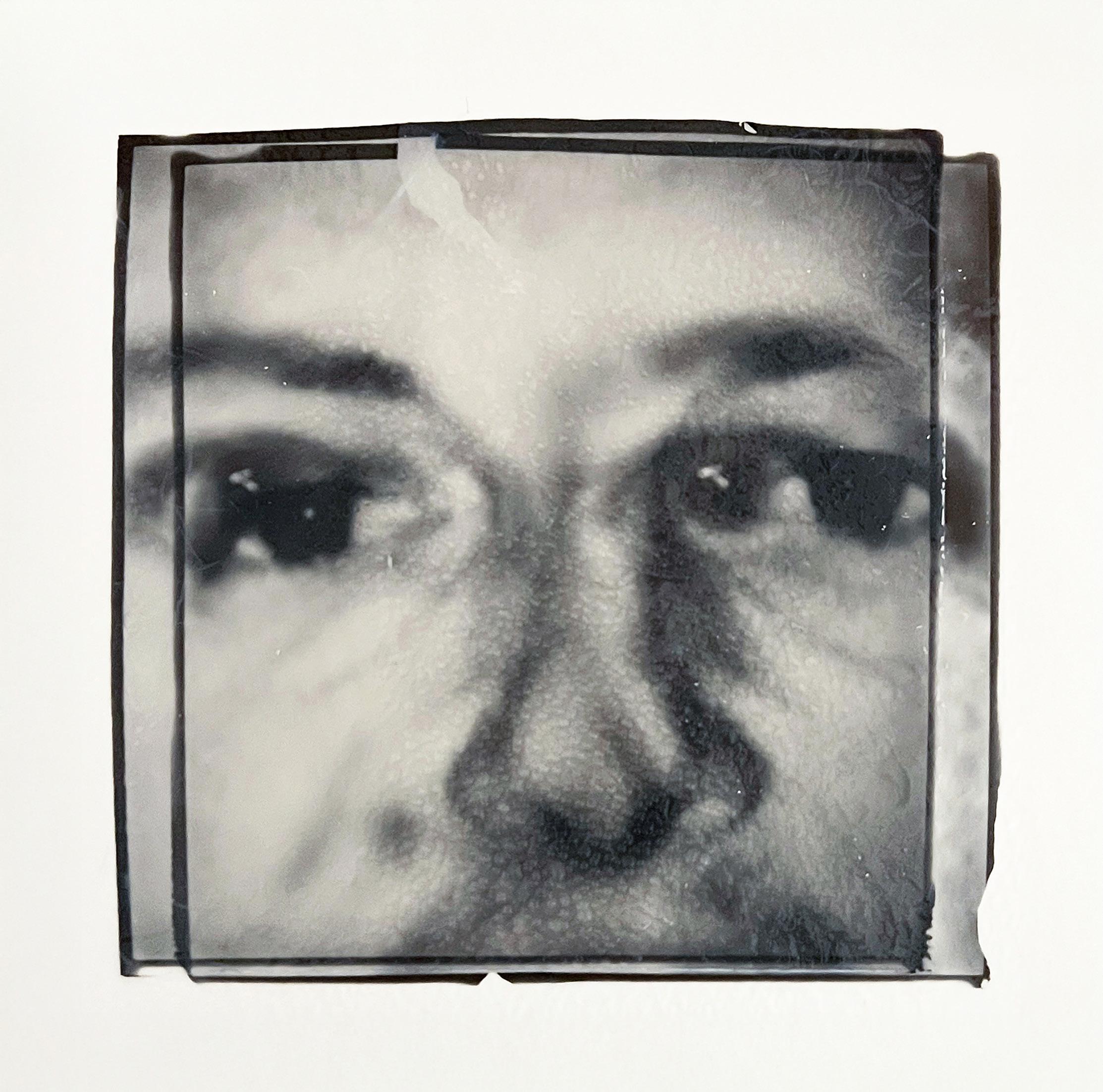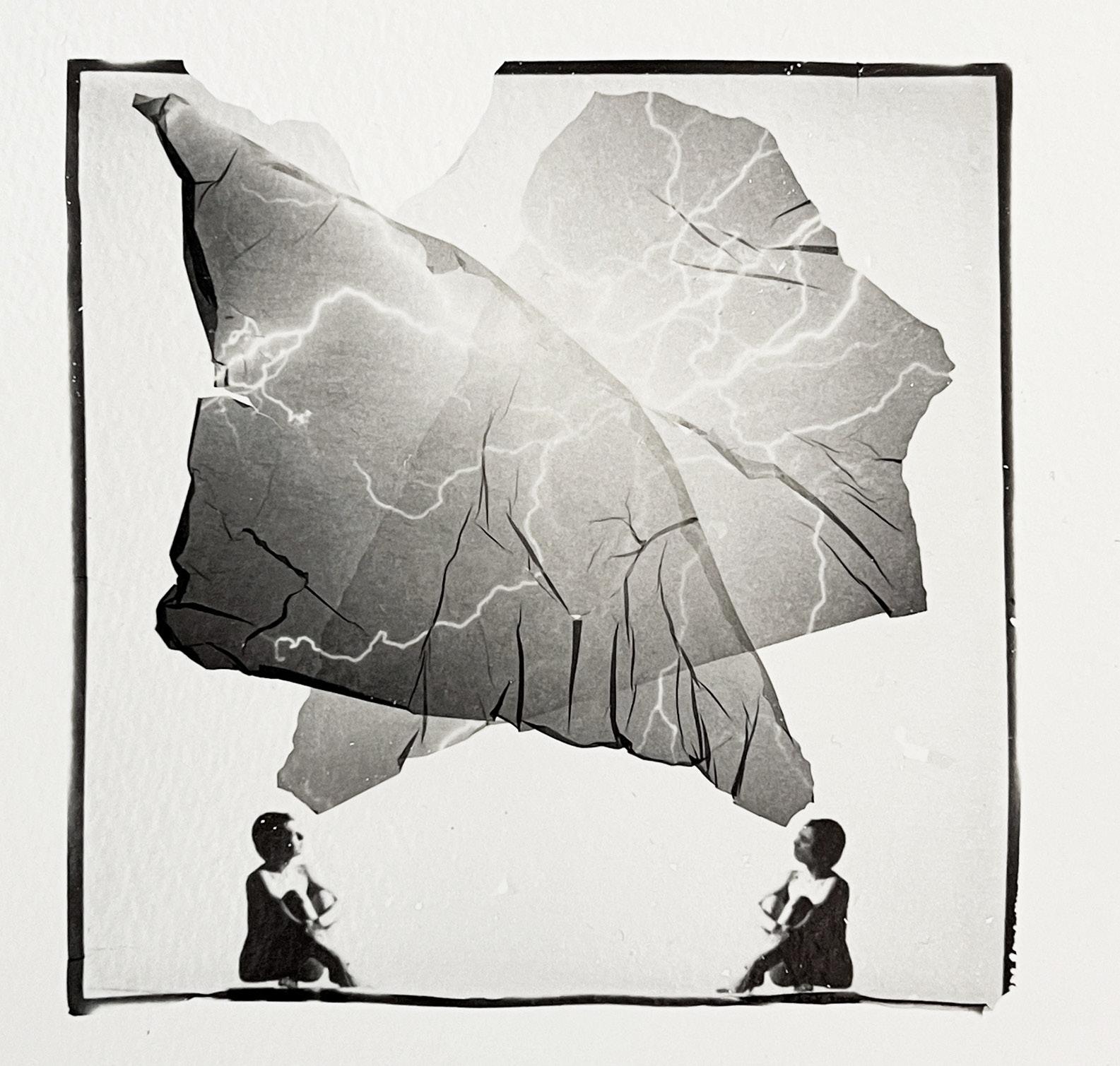 Through layered emulsions and hand-cut Polaroids, I also enact a union within the medium itself by joining disparate images, physical emulsions, gestures, and fragments into new, embodied wholes. The emulsion, once on a Polaroid, is now bound to a new medium. Each piece is a collage of relational energy: two trees reaching toward each other across a fogged field; a young figure conjuring connection; a figure in mourning under a wedding canopy.