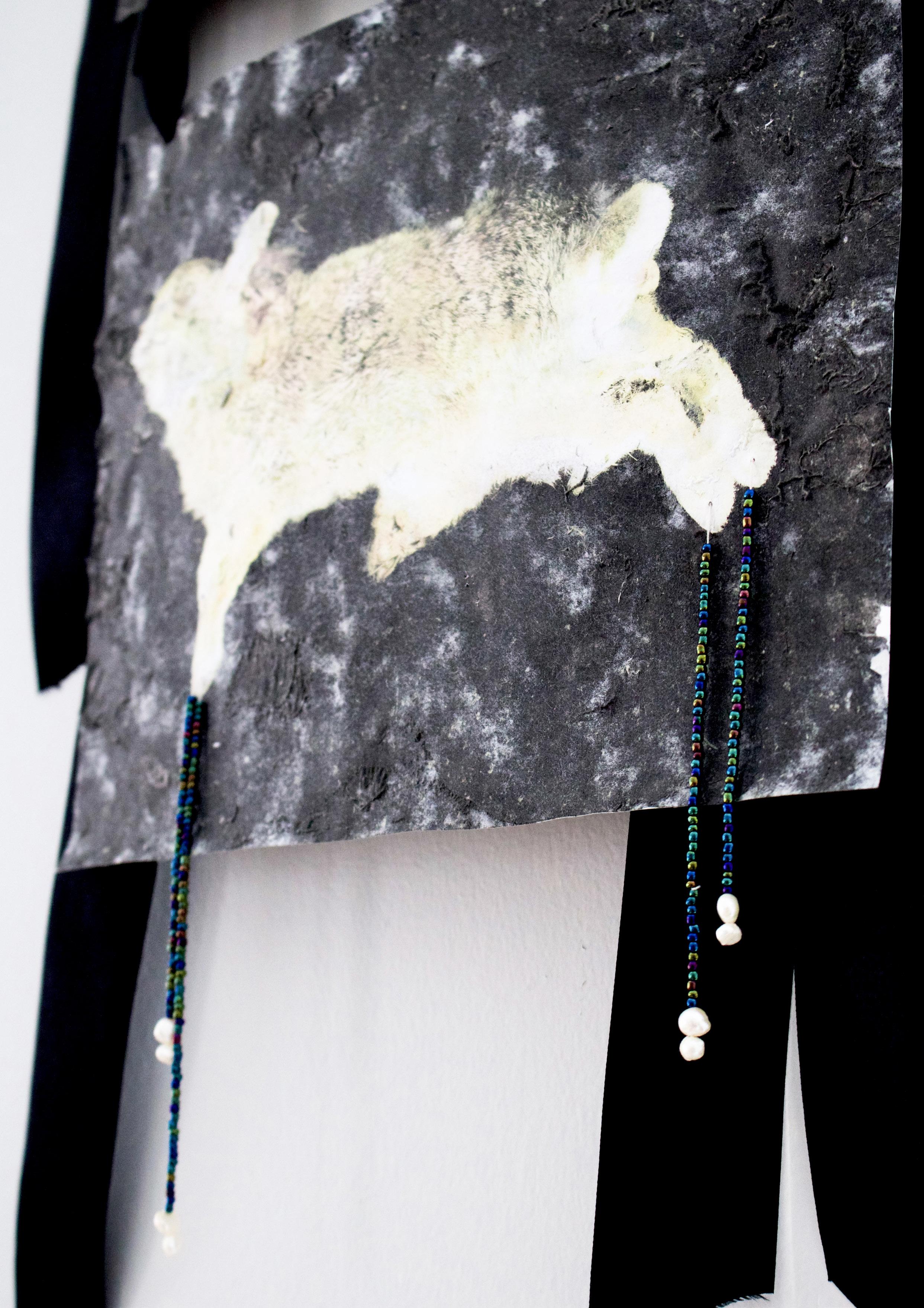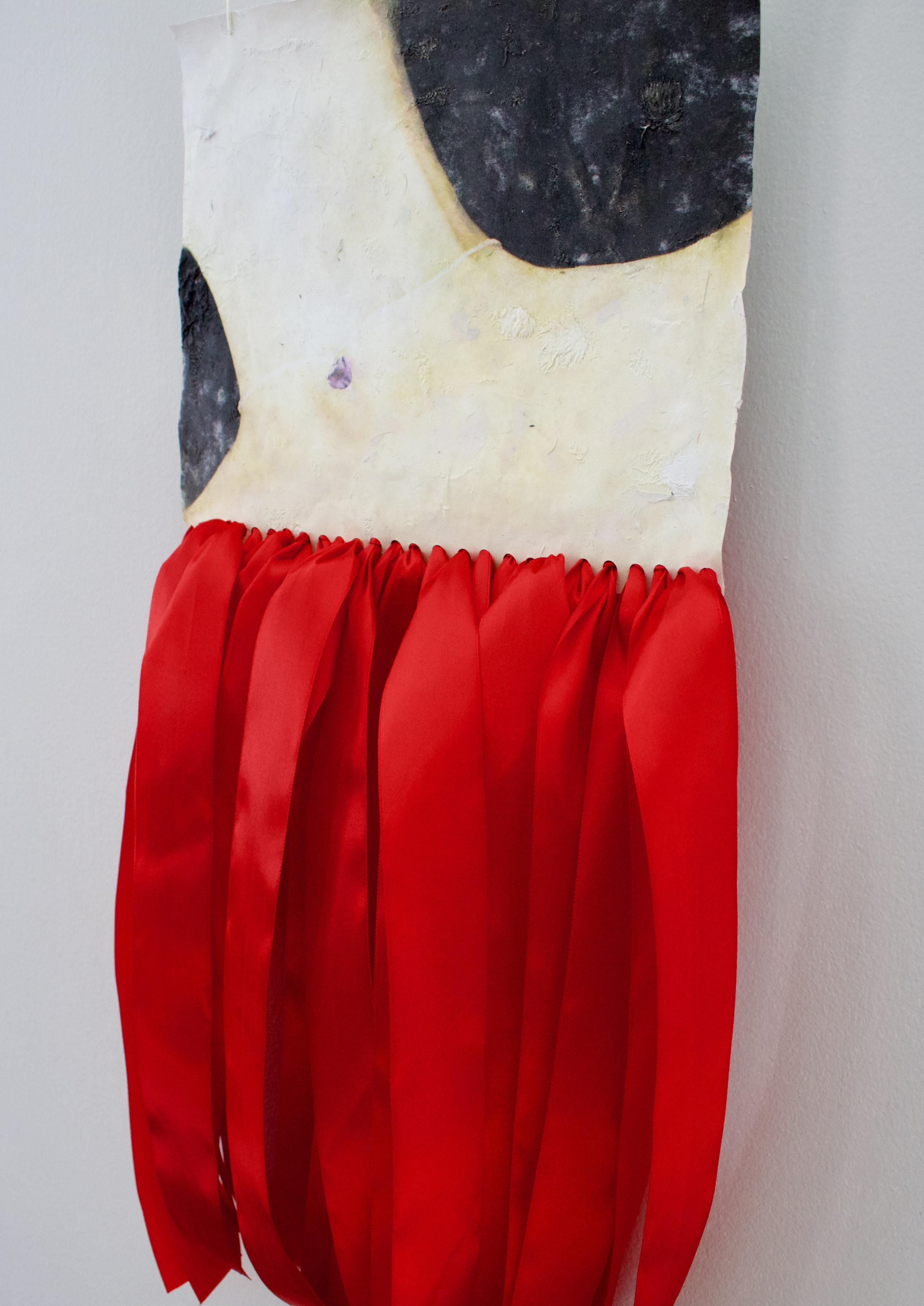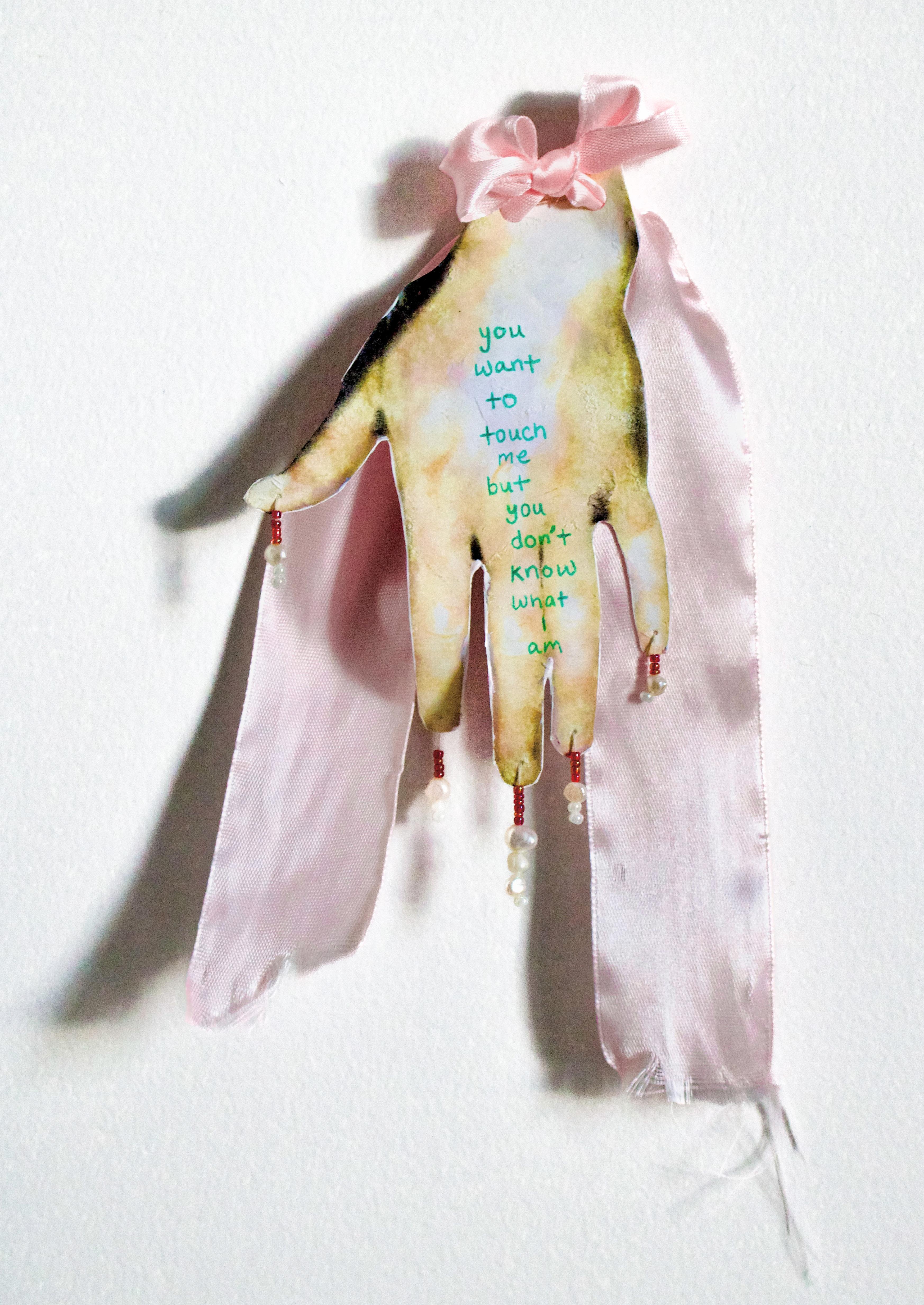 For these works, I create photo transfers using acrylic paint. With this technique, I alter the photographic materials in ways I cannot fully control, and make an image that is in a liminal state between painting and photo. I combine these photo transfers with beading and ribbons, melding traditional 2D work with textile art. The hand wall hanging, with the text, “you want to touch me but you don’t know what I am,” is intended as direct communication to a specific person, as well as to any viewer.
