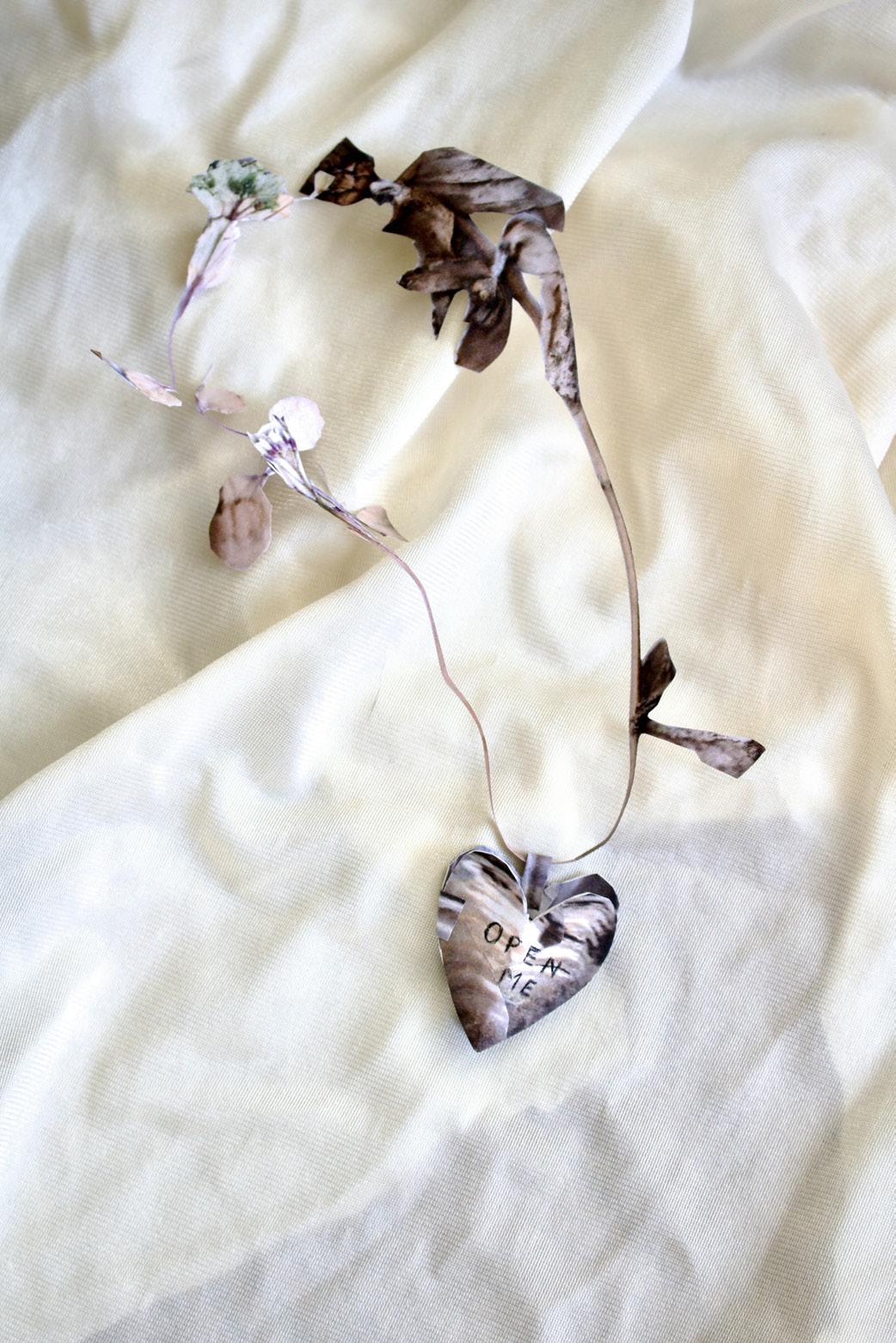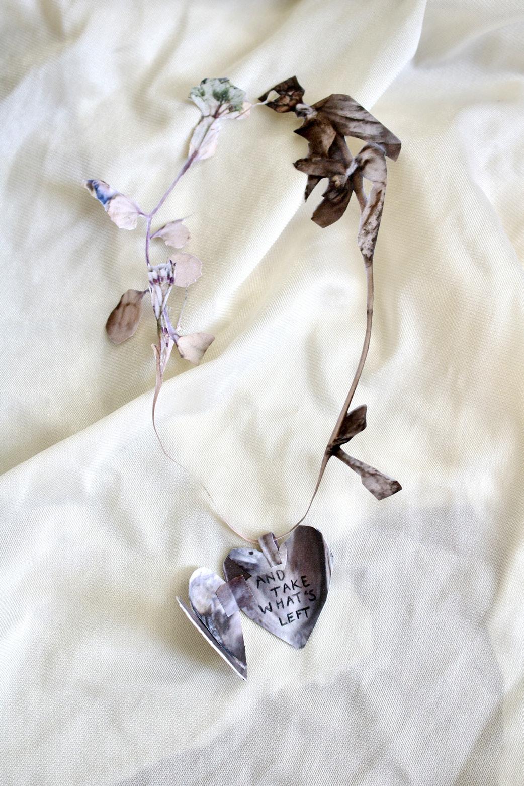 My locket paper sculpture is created from photographs of flowers and shells. It resembles a traditional locket necklace and features the inscriptions “open me” and “take what’s left.”