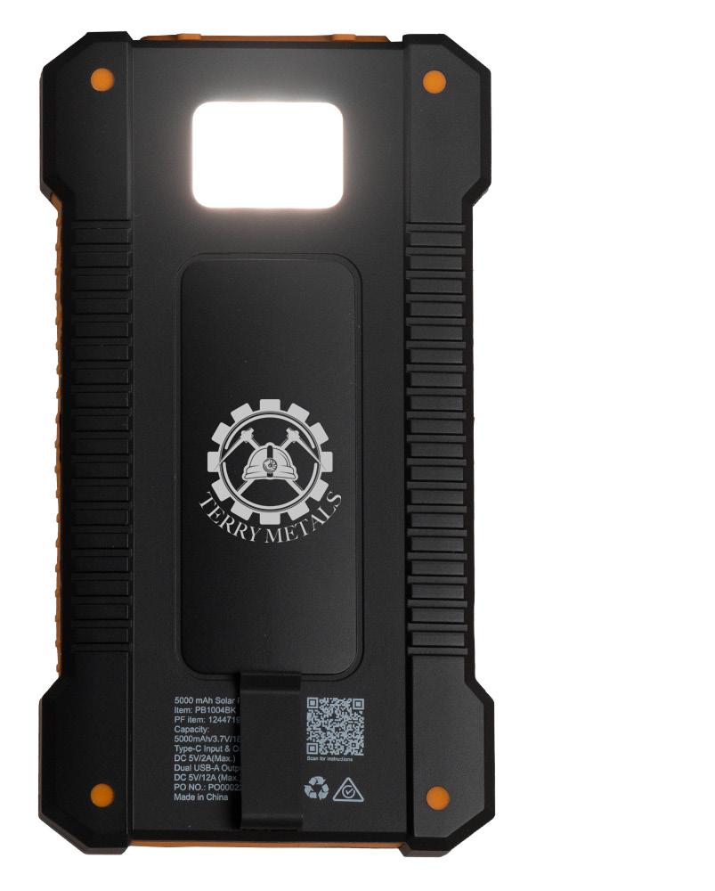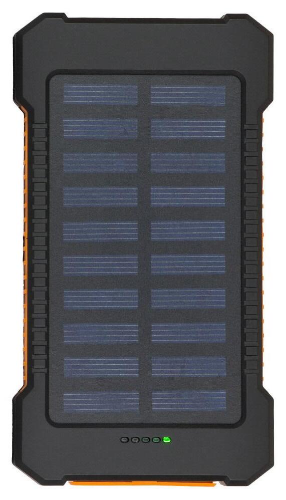 The Radiant 5000 mAh solar power bank, made from recycled plastic, is built for durability and convenience. Designed with a rugged exterior, it features a removable clip for easy attachment, a built-in torch, and connectors.