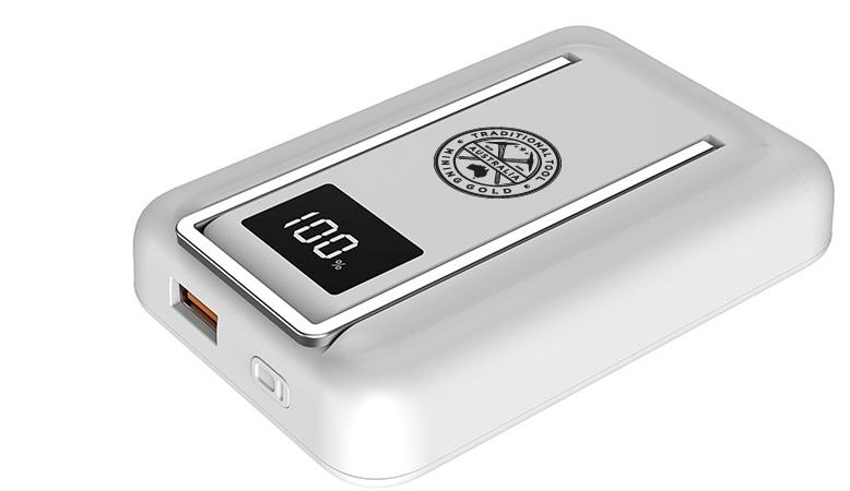 The Constant 10,000 mAh Wireless Power Bank has a rechargeable lithium polymer battery with LED display to show remaining capacity percentage.
