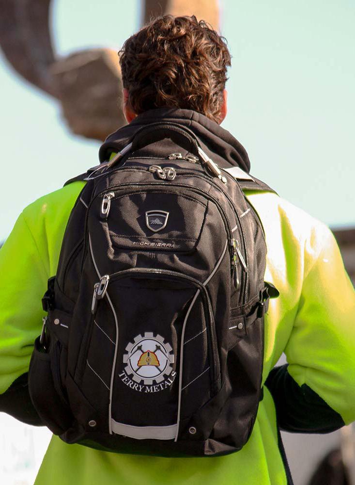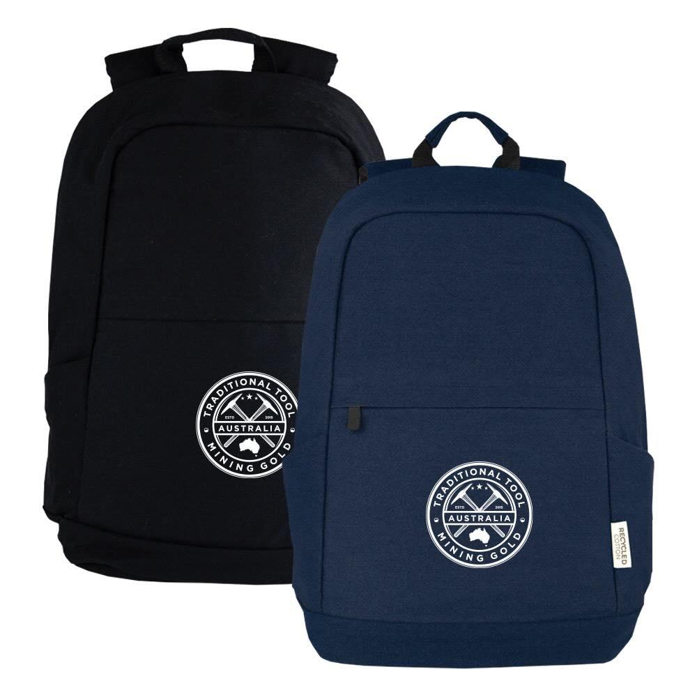 This backpack is crafted from recycled polyester, underscoring our commitment to environmental responsibility. Includes a larger zippered compartment equipped with a padded sleeve, designed to securely accommodate a 16” laptop. Top carry handle for easy grab-and-go