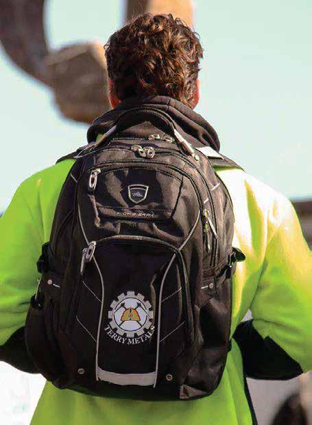 This backpack is crafted from recycled polyester, underscoring our commitment to environmental responsibility Includes a larger zippered compartment equipped with a padded sleeve, designed to securely accommodate a 16” laptop Top carry handle for easy grab-and-go