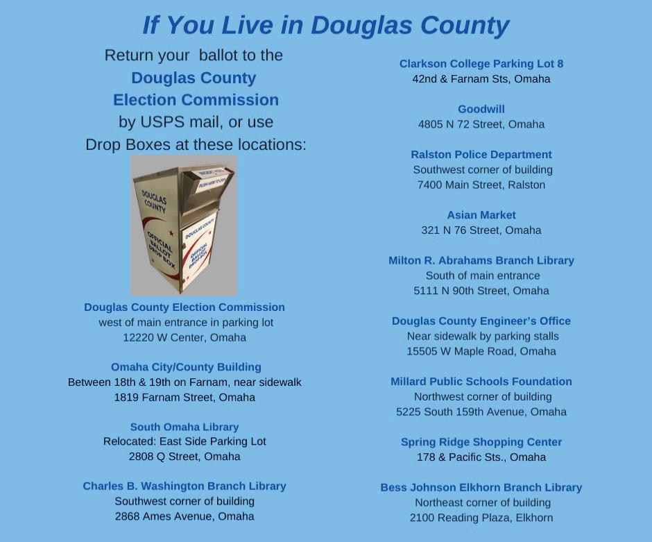 More information at www.votedouglascounty.com. Contact the Election Commission at earlyvoting@votedouglascounty.com or (402) 444-VOTE [8683] if you have questions.