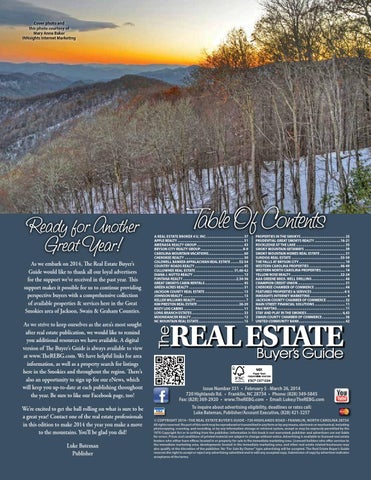 Issue Number 331 • February 5 - March 26, 2014 720 Highlands Rd. • Franklin, NC 28734 • Phone: (828) 349-5845 Fax: (828) 369-2920 • www.TheREBG.com • Email: Luke@TheREBG.com To inquire about advertising eligibility, deadlines or rates call: Luke Bateman, Publisher/Account Executive, (828) 421-3257 © COPYRIGHT 2014 • THE REAL ESTATE BUYER’S GUIDE • 720 HIGHLANDS ROAD • FRANKLIN, NORTH CAROLINA 28734