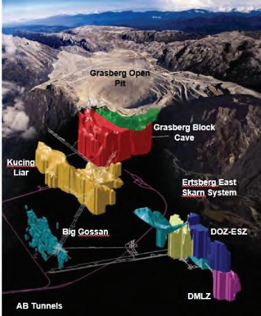 The DMLZ ore body lies below the DOZ Underground Mine at the 2,590-metre elevation and represents the downward continuation of mineralization in the Ertsberg East Skarn system and neighboring Ertsberg porphyry.