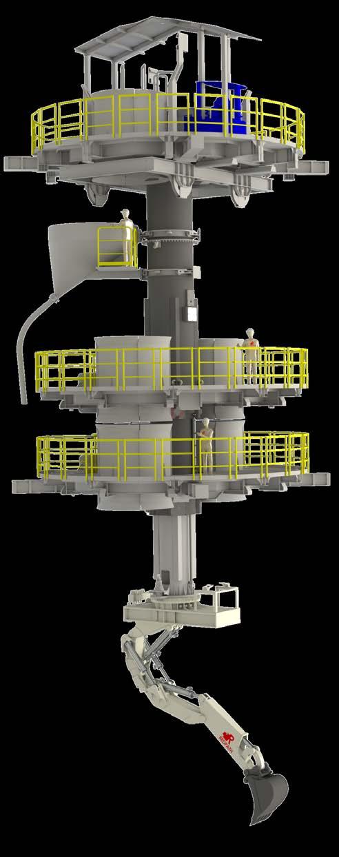 Currently finishing the tower-mounted testing phase in Germany, where it was designed and assembled, Redpath has proposed the fourth generation of the stage-mounted hydraulic excavator shaft-mucking unit, called the S-100. This new model is a complete rethink of the original S-20 hydraulic mucker, incorporating lessons learned from previous iterations. Redpath has designed and built the prototype unit, and is in design for the independent telescoping stage suspension system.